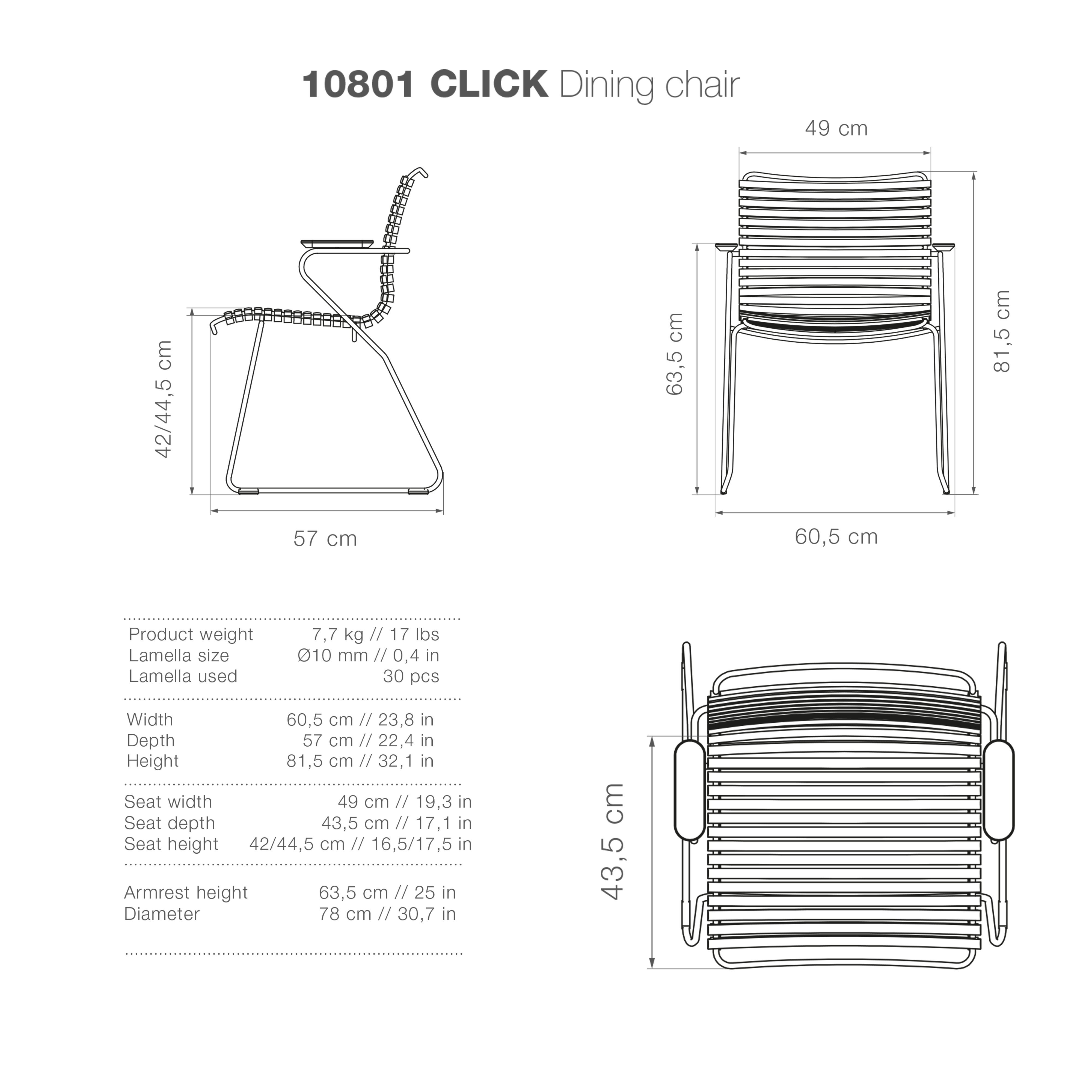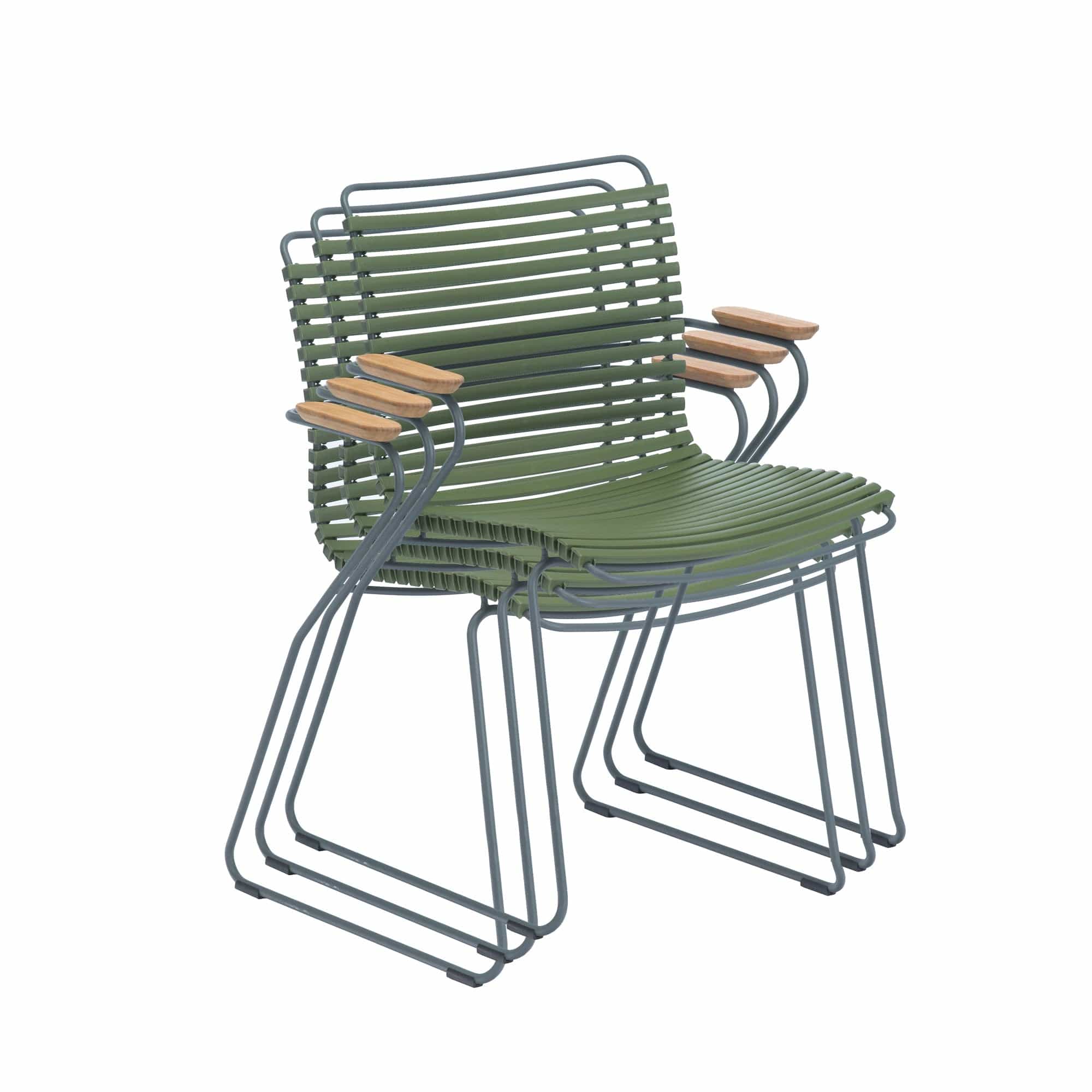 The lamellas can be replaced and mixed or matched in different colours, allowing you to refresh your look whenever you like and ensure your chair lasts for many years. The CLICK dining chairs are also stackable; a great space-saving option for patios, decks or smaller outdoor areas. Durable, customisable, and comfortable, the CLICK chair with armrests is made to elevate your outdoor dining experience.