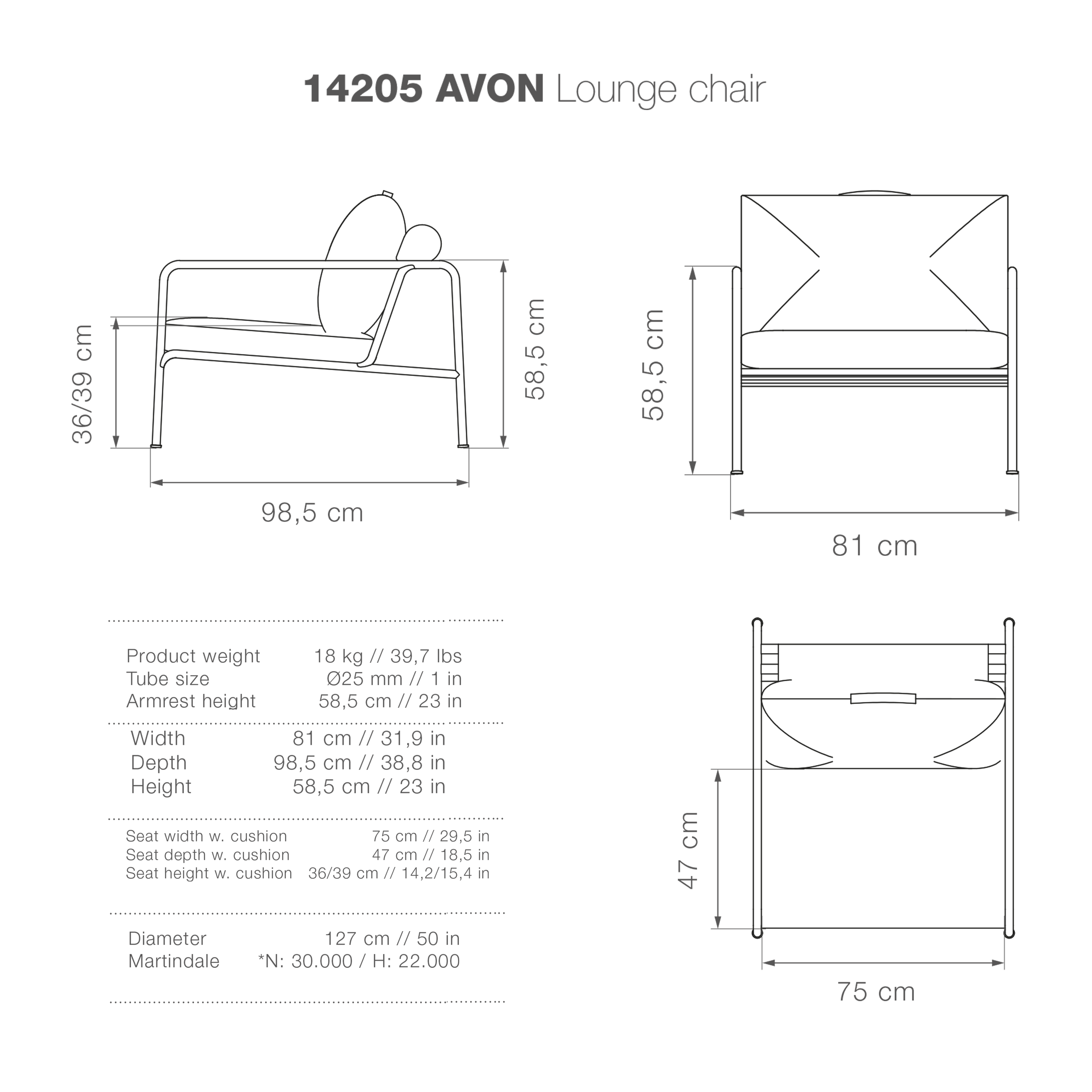 The cushions for AVON are made with Sunbrella Heritage fabric which contains 50% recycled acrylic. Colorfull fibre ends from the process of reusing the primary material may appear in the weave and vary the fabric colour from one batch to another. This creates a unique fabric with a natural look and vintage charm.