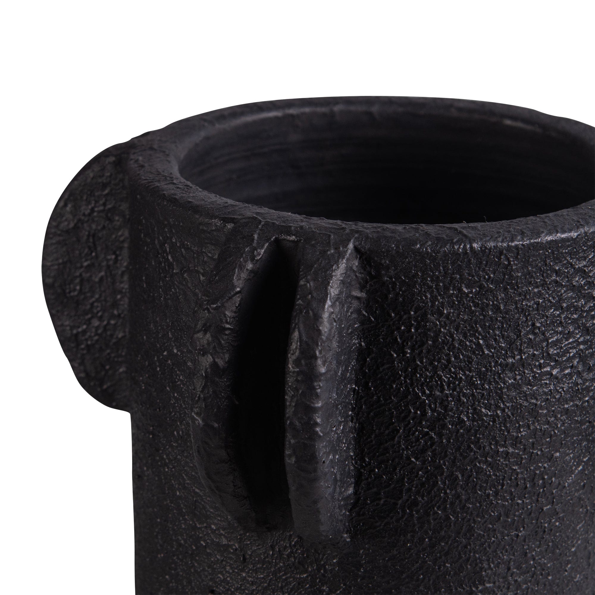 - Design: Showcasing a squat shape adorned with half-circle handle patterns that pay homage to the classical era of the ancient world. Its muted black color finish is textured, providing a natural, earthy aesthetic.