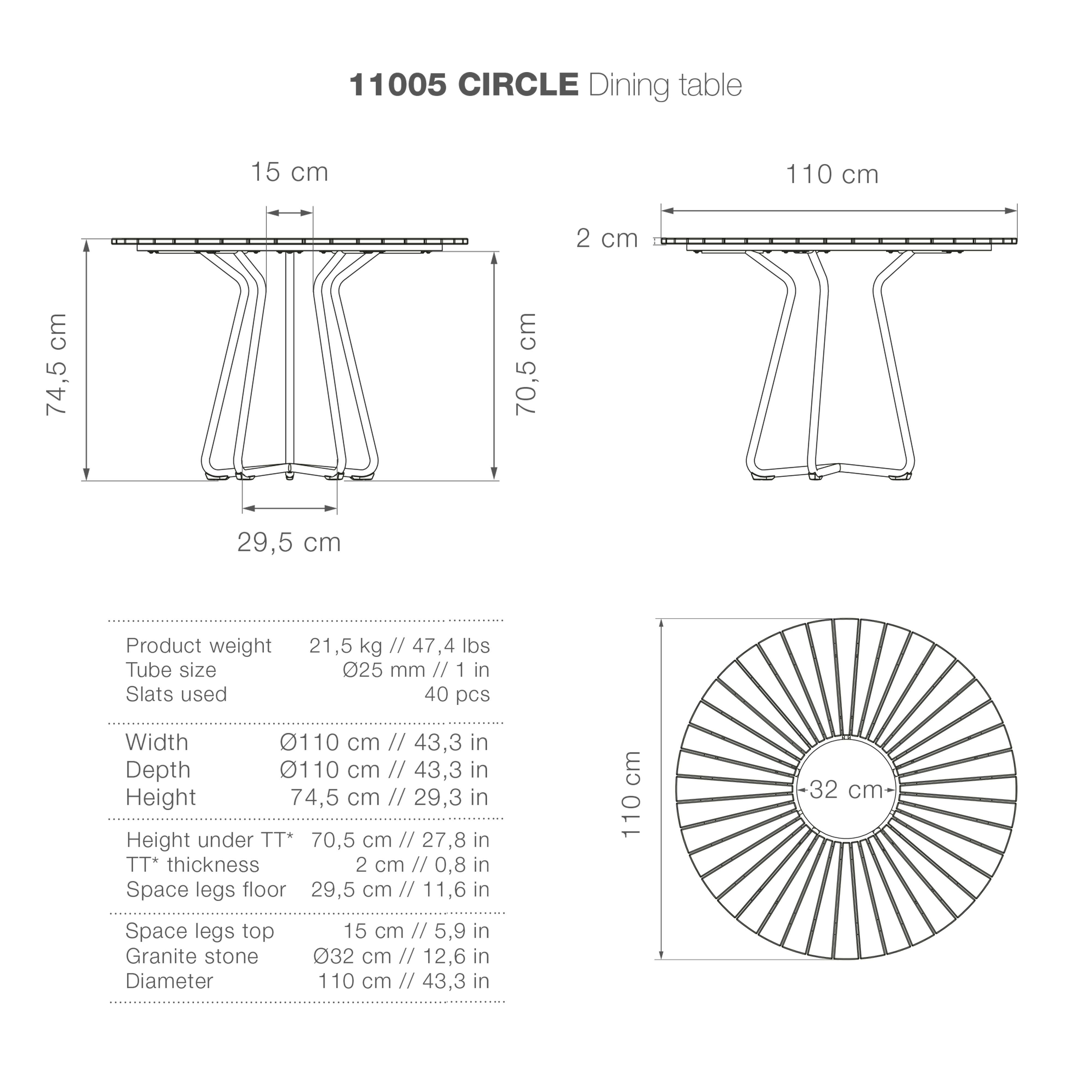 Designed by Henrik Pedersen, the Circle table in diameter 110cm consists of laminated bamboo slats encircling a mottled grey granite stone centre piece, and leg construction in grey powder-coated aluminium. Resembling an open flower, the beautiful and well-proportioned dining table enables free seating as the leg construction is drawn in under the table to provide comfortable legroom. The decorative granite stone piece in the table centre provides stability & space for hot pots.