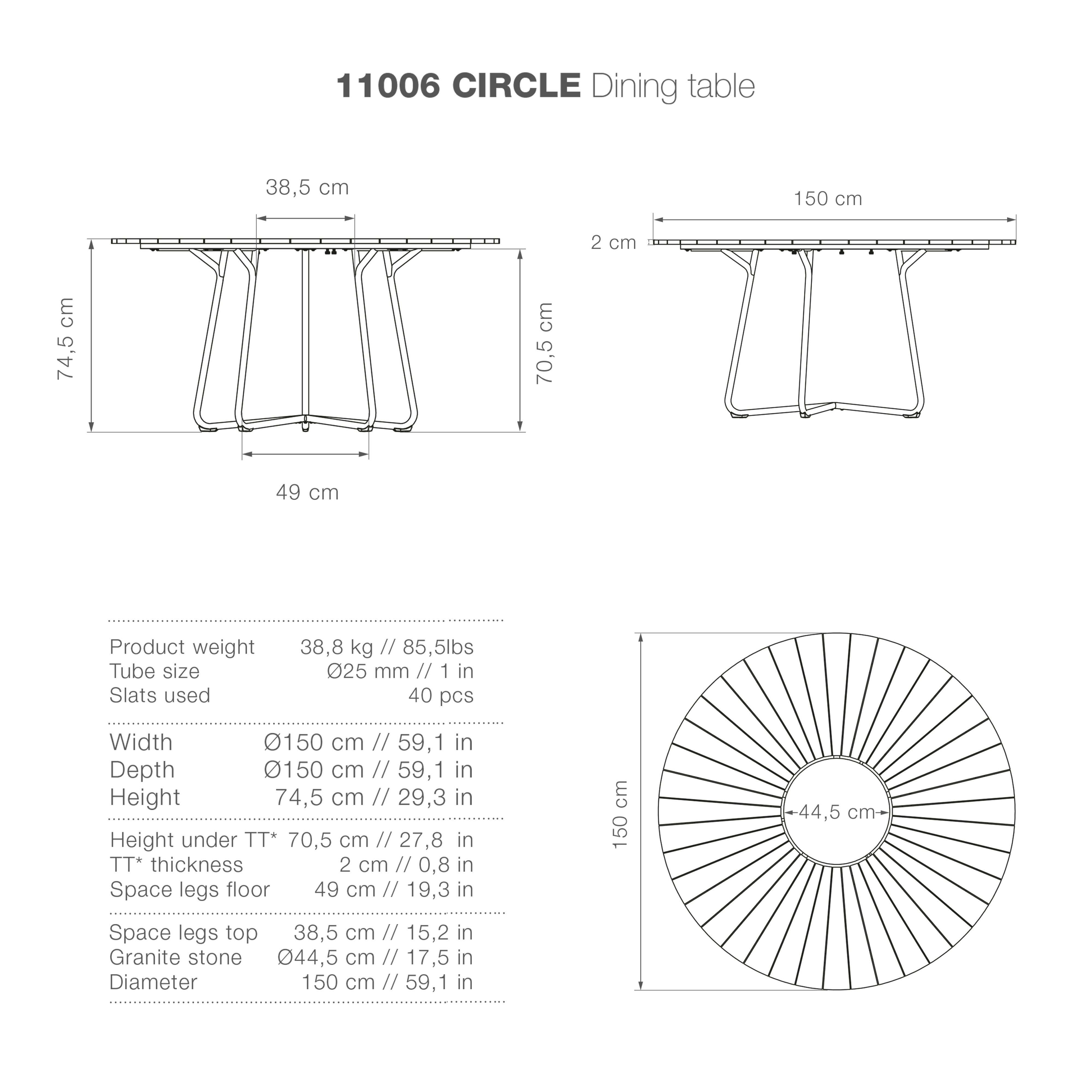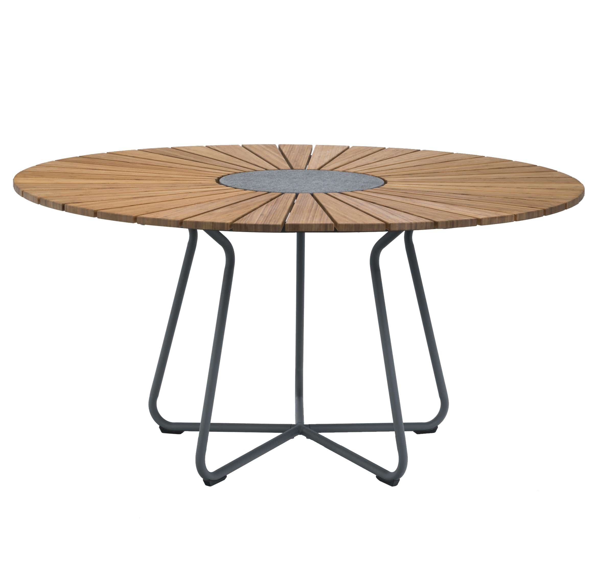 Designed by Henrik Pedersen, the Circle table in diameter 150cm consists of laminated bamboo slats encircling a mottled grey granite stone centre piece, and leg construction in grey powder-coated aluminium. Resembling an open flower, the beautiful and well-proportioned dining table enables free seating as the leg construction is drawn in under the table to provide comfortable legroom. The decorative granite stone piece in the table centre provides stability & space for hot pots.