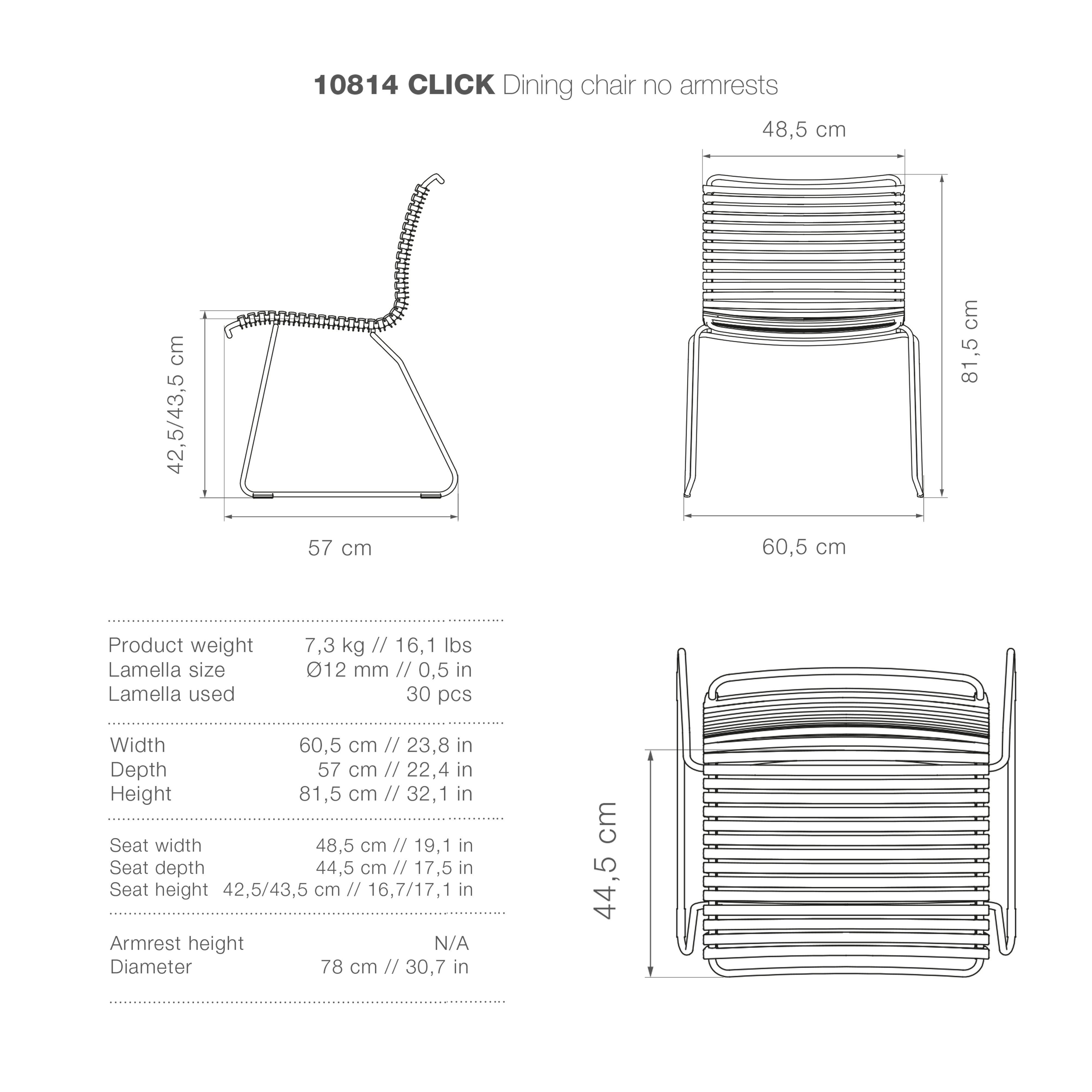 The lamellas can be replaced, meaning your CLICK chair is long-lasting and can be personalised by mixing and matching colours to suit your style. The CLICK dining chairs are also stackable, a smart, space-saving solution for balconies, patios or compact dining areas. Stylish, practical and built to last, the CLICK chair brings effortless design and functionality to outdoor dining.