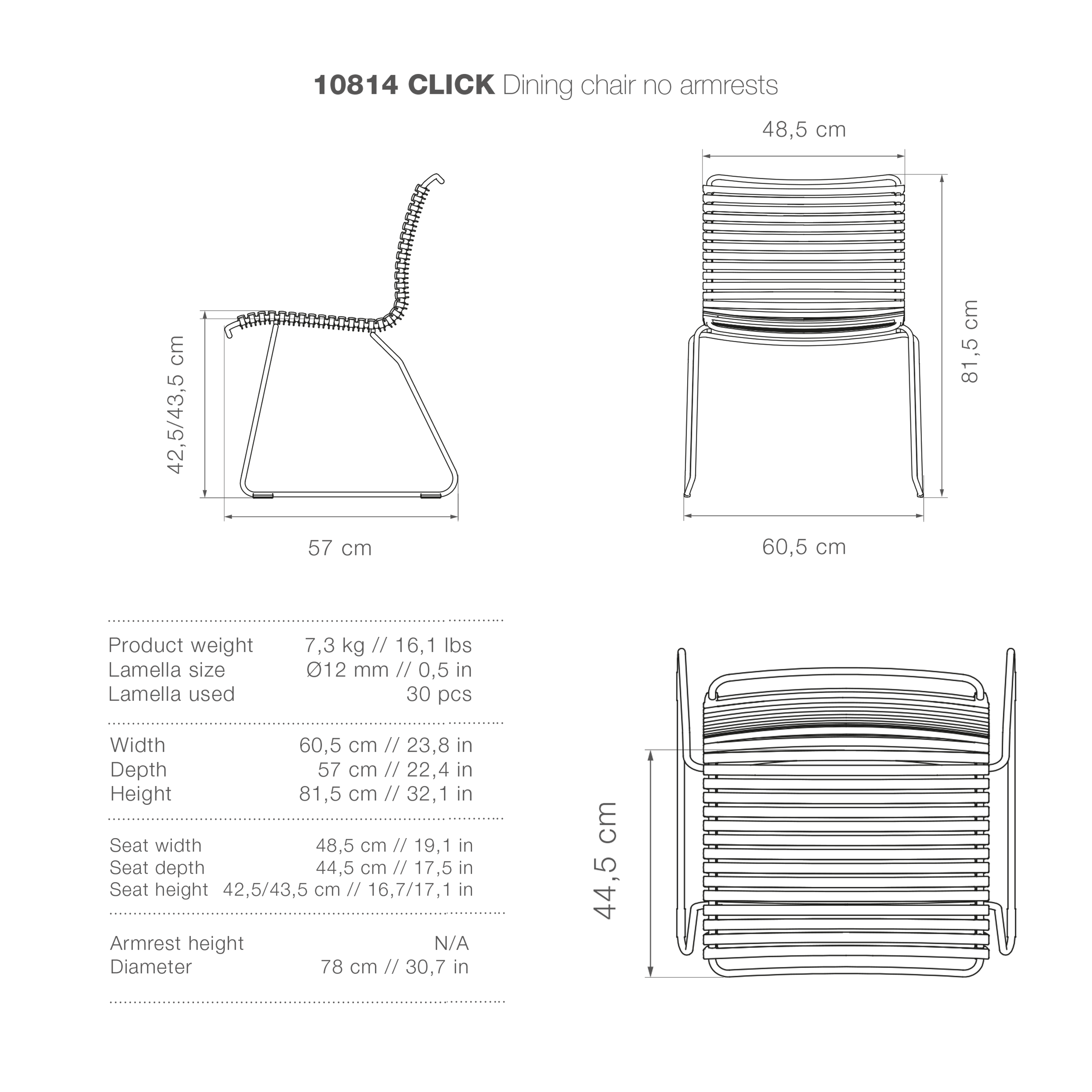 The lamellas can be replaced, meaning your CLICK chair is long-lasting and can be personalised by mixing and matching colours to suit your style. The CLICK dining chairs are also stackable, a smart, space-saving solution for balconies, patios or compact dining areas. Stylish, practical and built to last, the CLICK chair brings effortless design and functionality to outdoor dining.