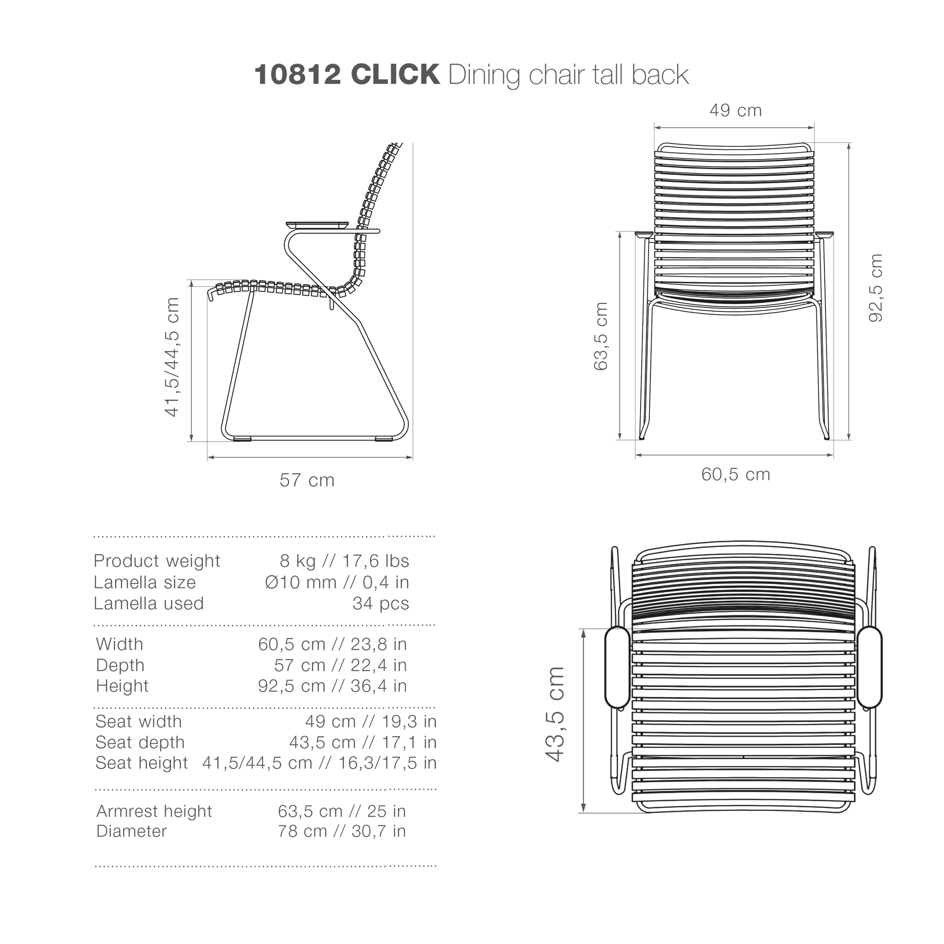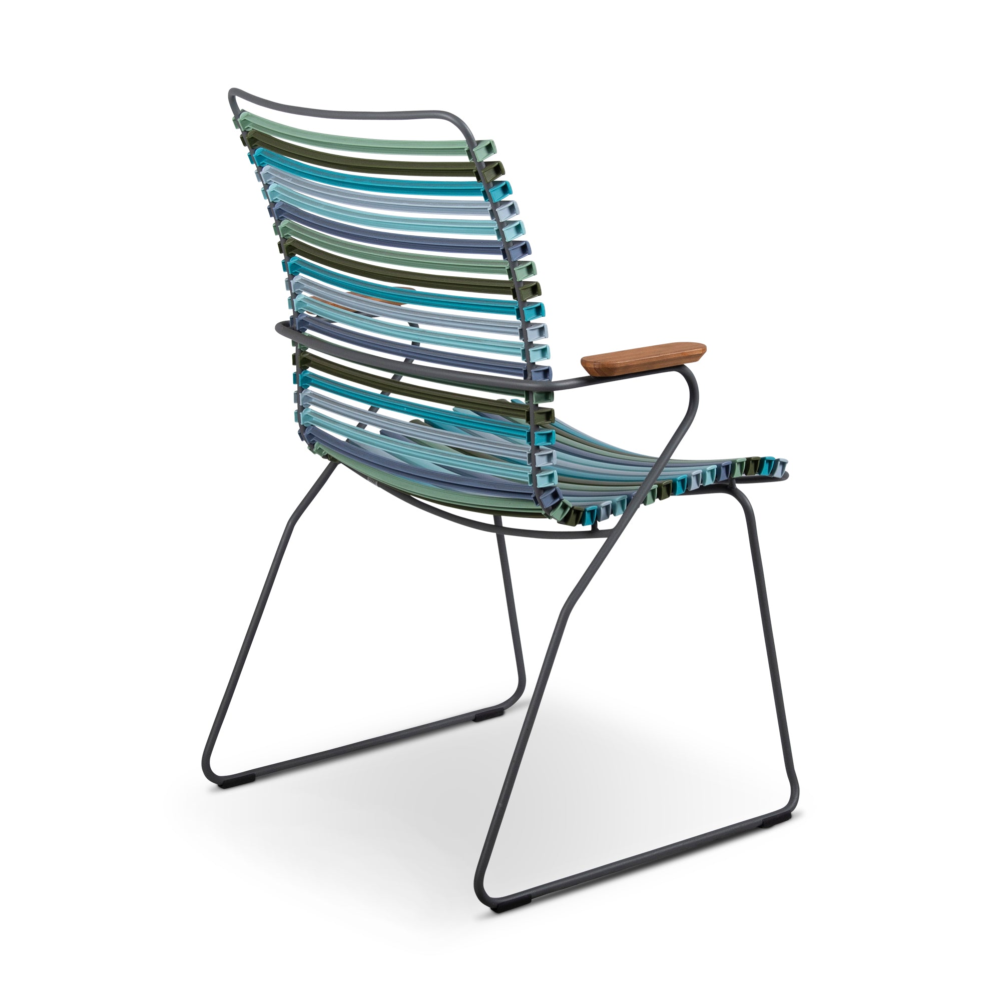 The lamellas can be replaced and mixed or matched in different colours, allowing you to refresh your look whenever you like and ensure your chair lasts for many years. The CLICK dining chairs are also stackable, making them a great space-saving option for patios, decks or smaller outdoor areas. Durable, customisable, and comfortable, the CLICK chair with armrests is made to elevate your outdoor dining experience.