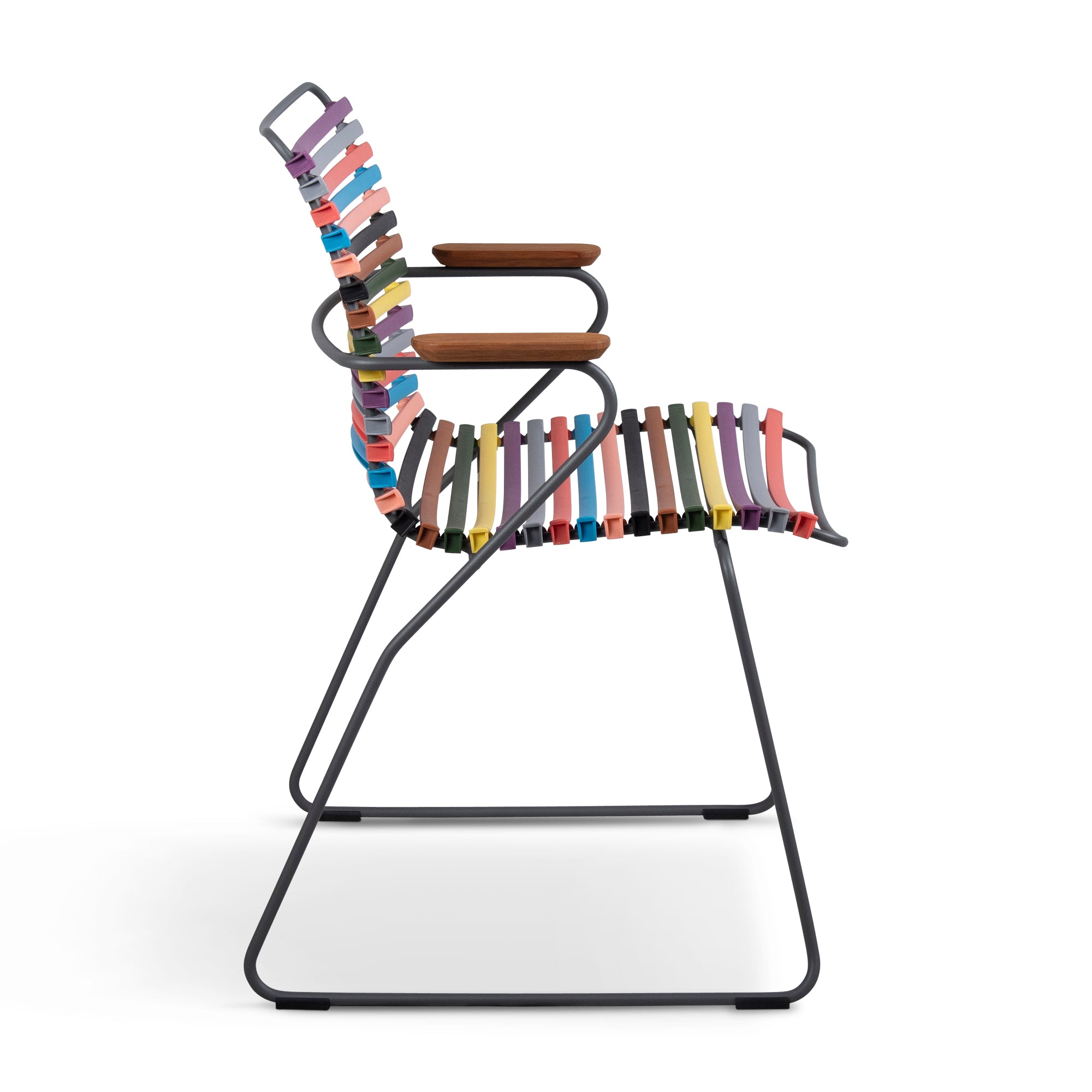 The lamellas can be replaced and mixed or matched in different colours, allowing you to refresh your look whenever you like and ensure your chair lasts for many years. The CLICK dining chairs are also stackable, making them a great space-saving option for patios, decks or smaller outdoor areas. Durable, customisable, and comfortable, the CLICK chair with armrests is made to elevate your outdoor dining experience.