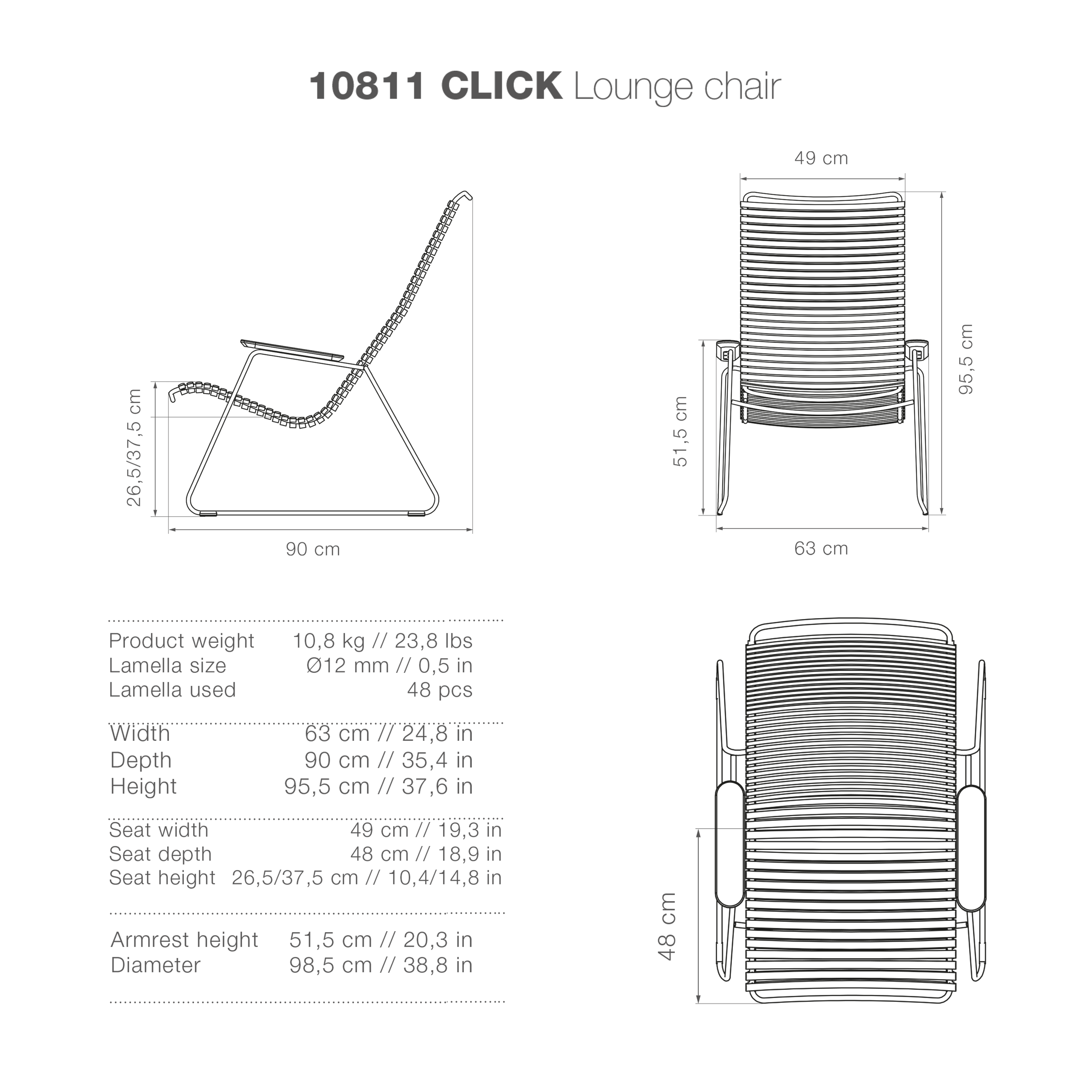 The Click Lounge chair is an extension of Click Rocking chair. The comfort is the same - so for those who are not about to rock, choose the Lounge chair. The Click Lounge chair is made from a solid powder coated steel frame, with ergonomic plastic lamellas which mould to your contour providing support and comfort. The armrests are made from sustainable bamboo laminate. We recommend the Houe Outdoor Oil to maintain the bamboo armrests.