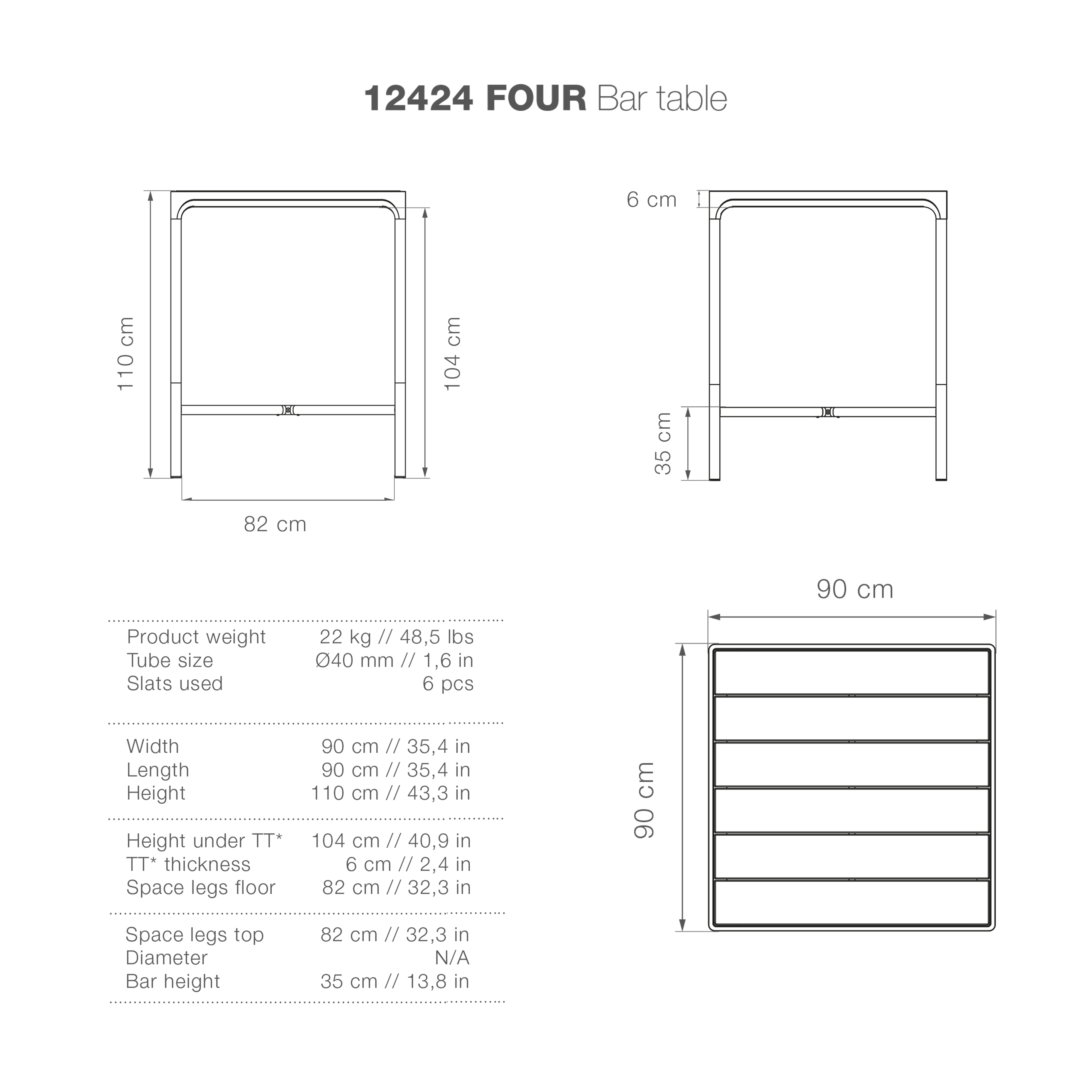Designed by Henrik Pedersen the Four Bar Table consists of a black Powder coated aluminium frame with a laminated bamboo tabletop, with leg extensions and support frame. This table works perfectly with the Reclips Barstools with plastic seat lamellas made from 100% post consumer plastic.