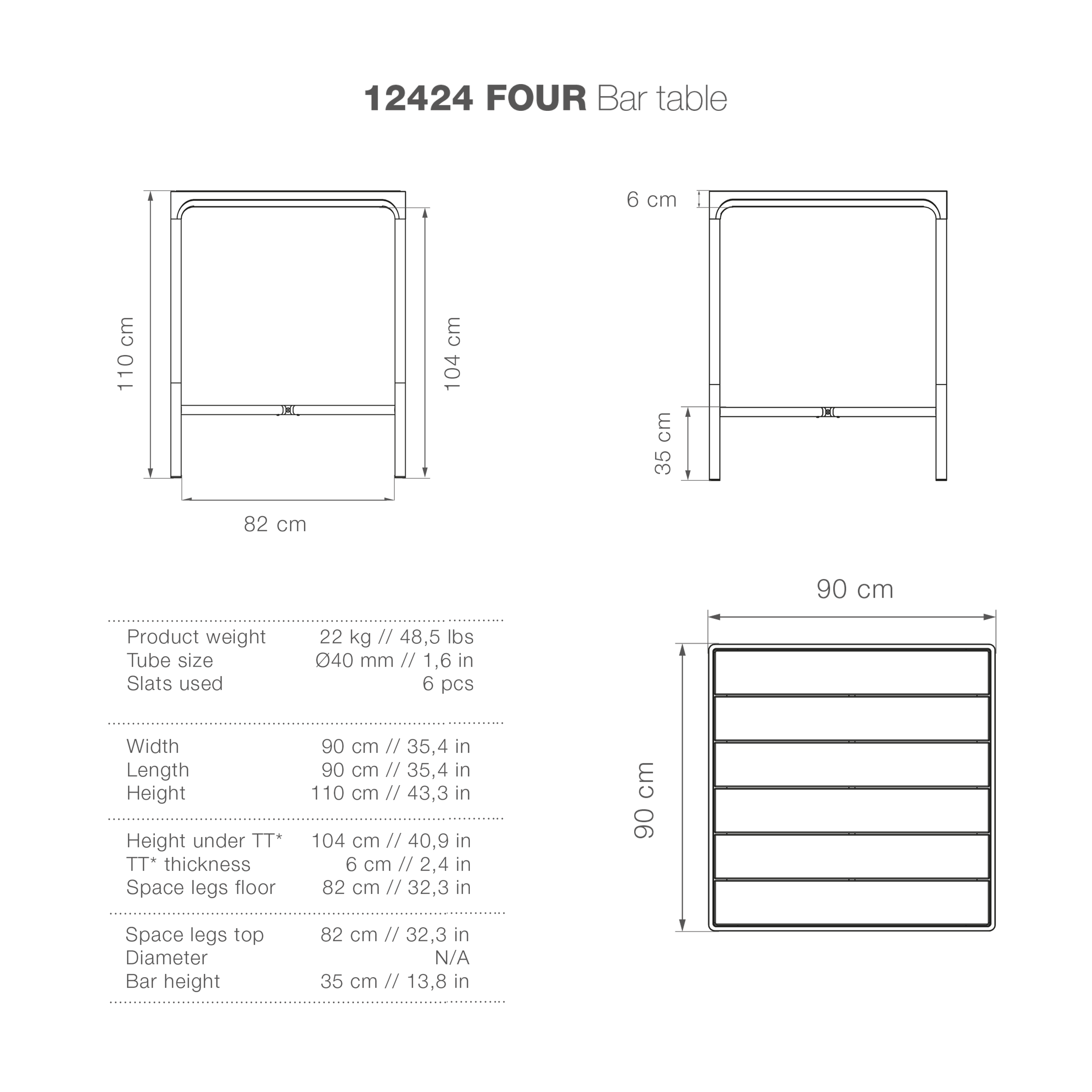 A dining table with a top and Four legs - that is what you get in Four, no matter which size you choose The frame and legs are made in powder coated aluminum, and table top in bamboo or aluminum