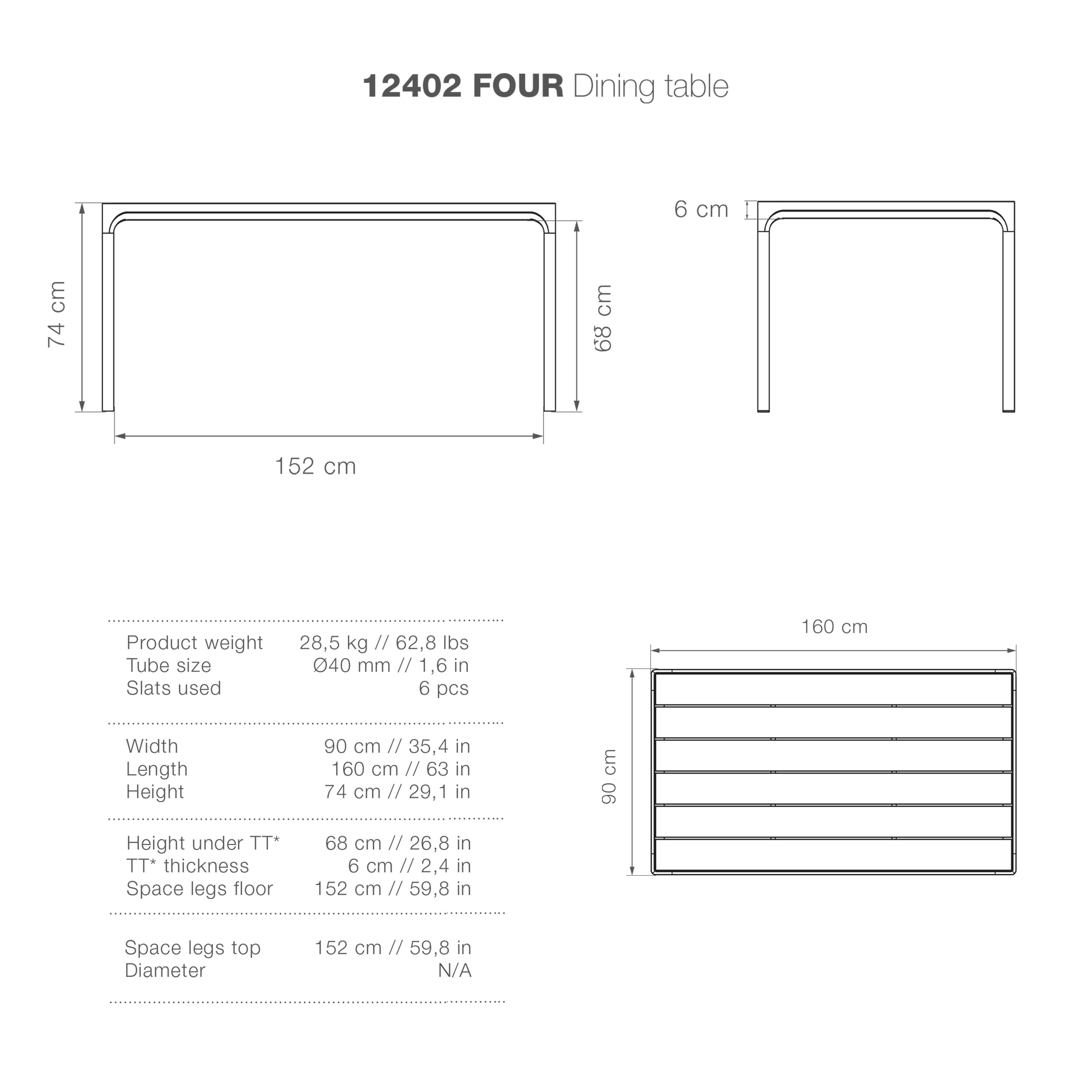 A dining table with a top and Four legs - that is what you get in Four, no matter which size you choose The frame and legs are made in powder-coated aluminum, and tabletop in bamboo or aluminium.