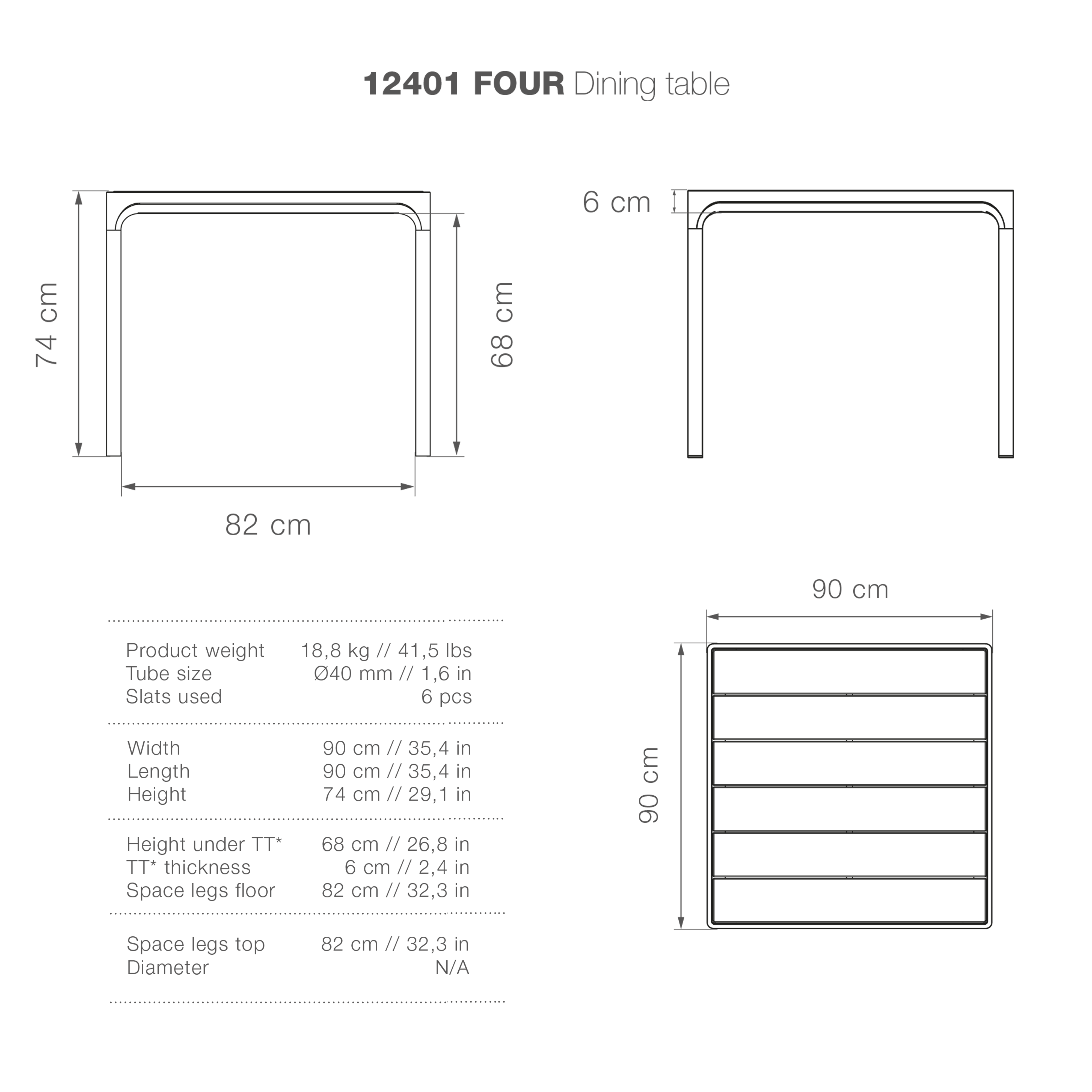 A dining table with a top and Four legs - that is what you get in Four, no matter which size you choose The frame and legs are made in powder-coated aluminium and tabletop in bamboo or aluminium. This table consists of the black powder coated aluminium frame, and the sustainable bamboo laminate lamella tabletop which is pre oiled. The tabletop requires re oiling as required. We recommend the Houe Outdoor Furniture Oil. Allow the bamboo to breath- do not use a cover over the tabletop when not in use. The table requires assembly.