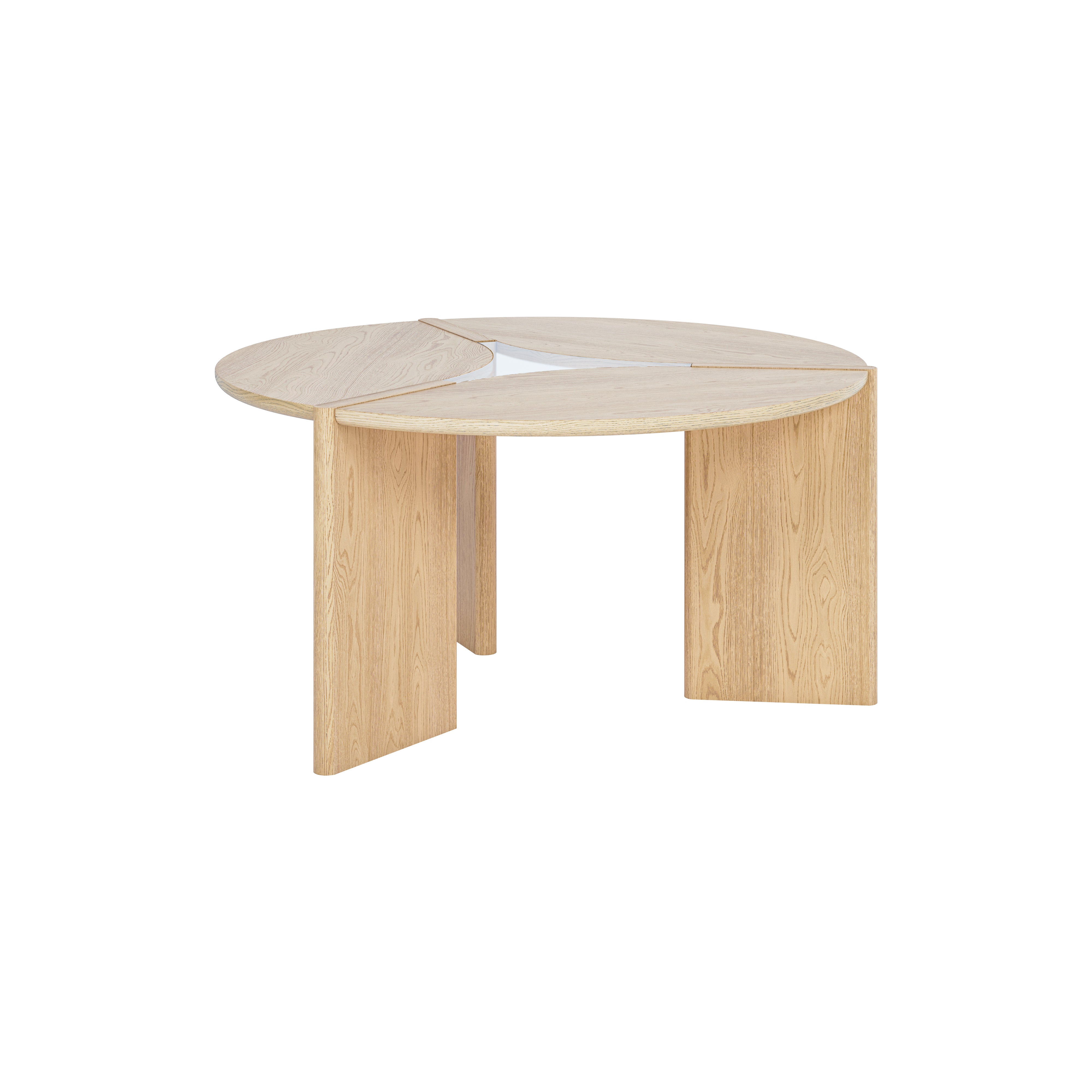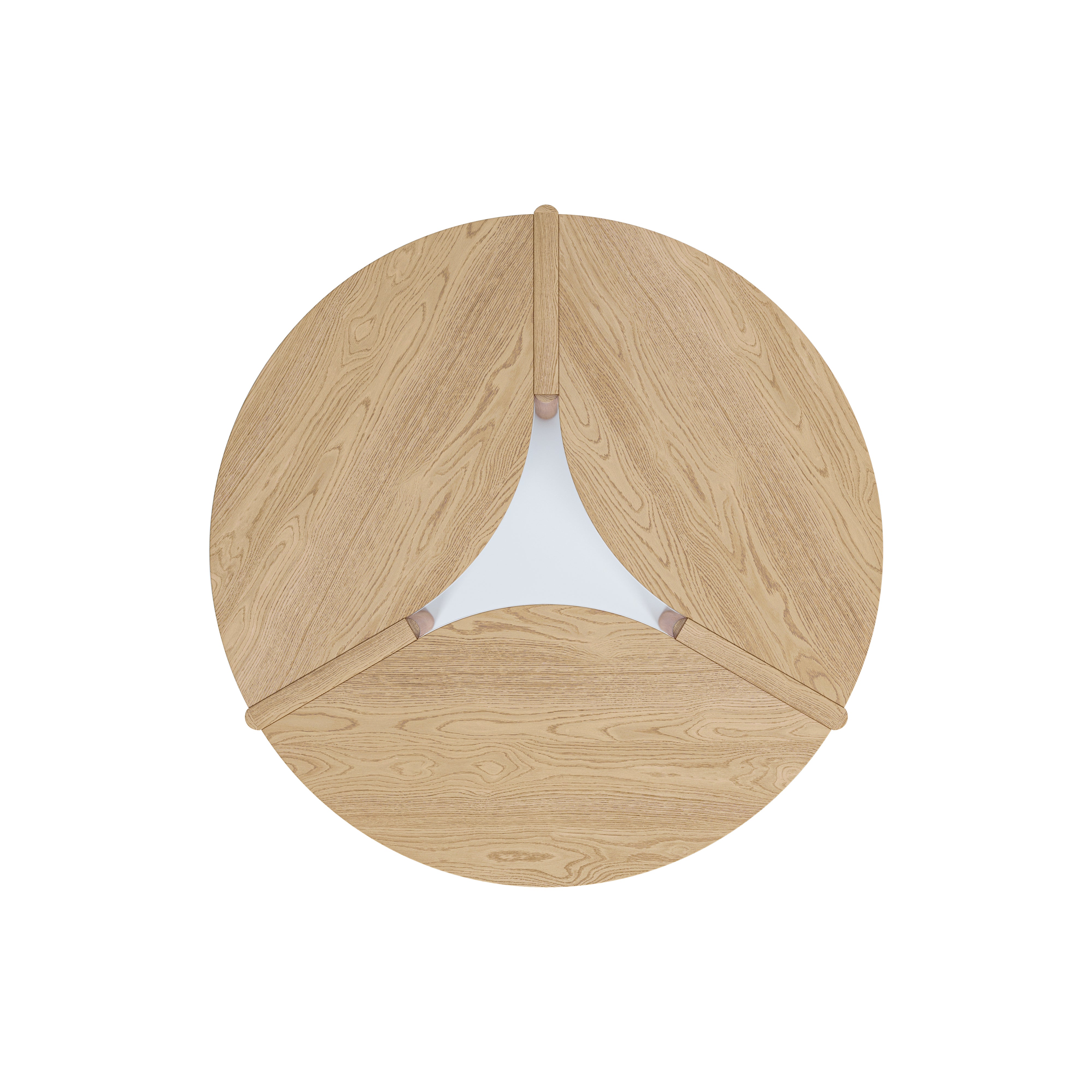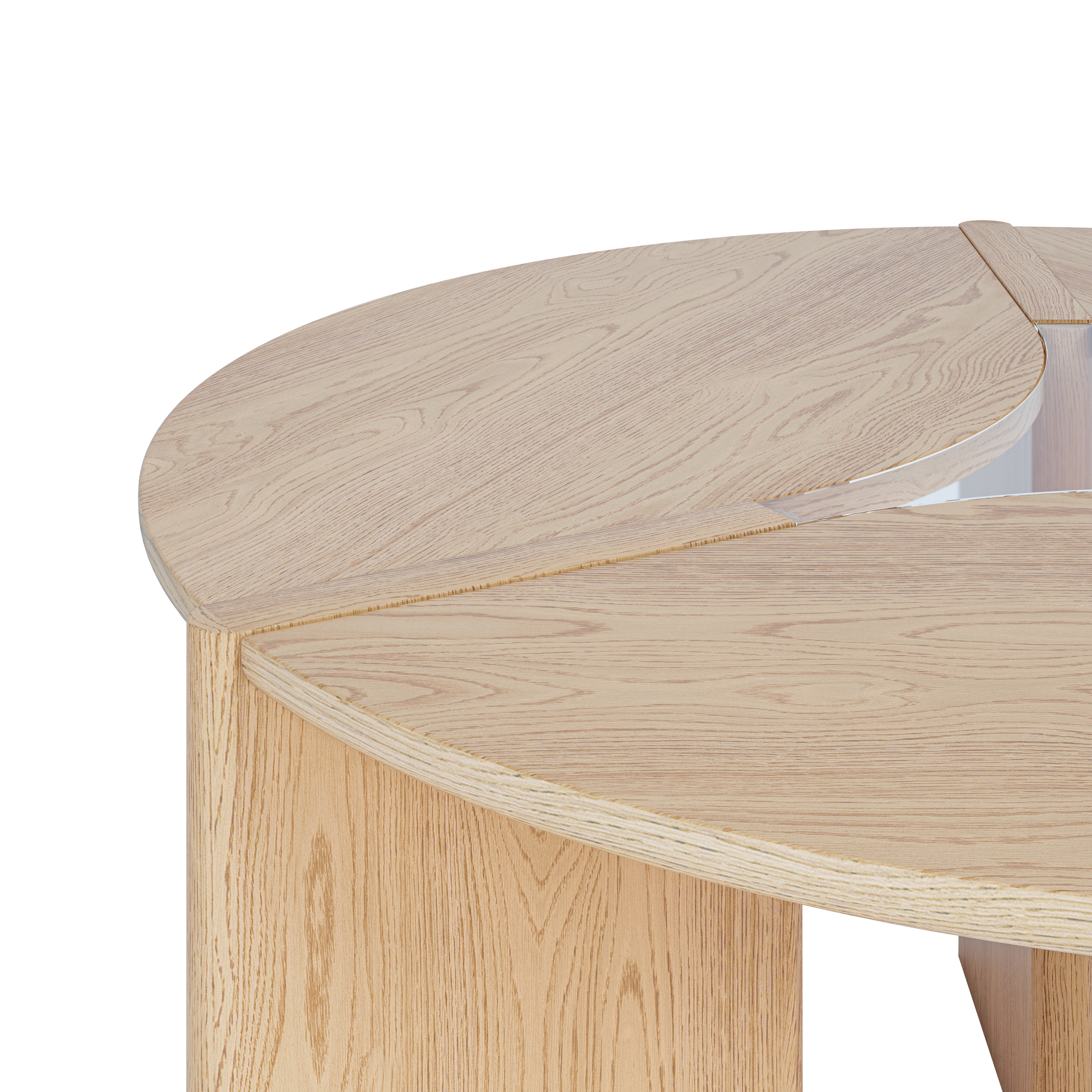 Its tabletop is formed from three sculptural segments that come together around a central open space. A clear tempered glass panel rests above this feature, adding function while preserving the table’s light and refined character.