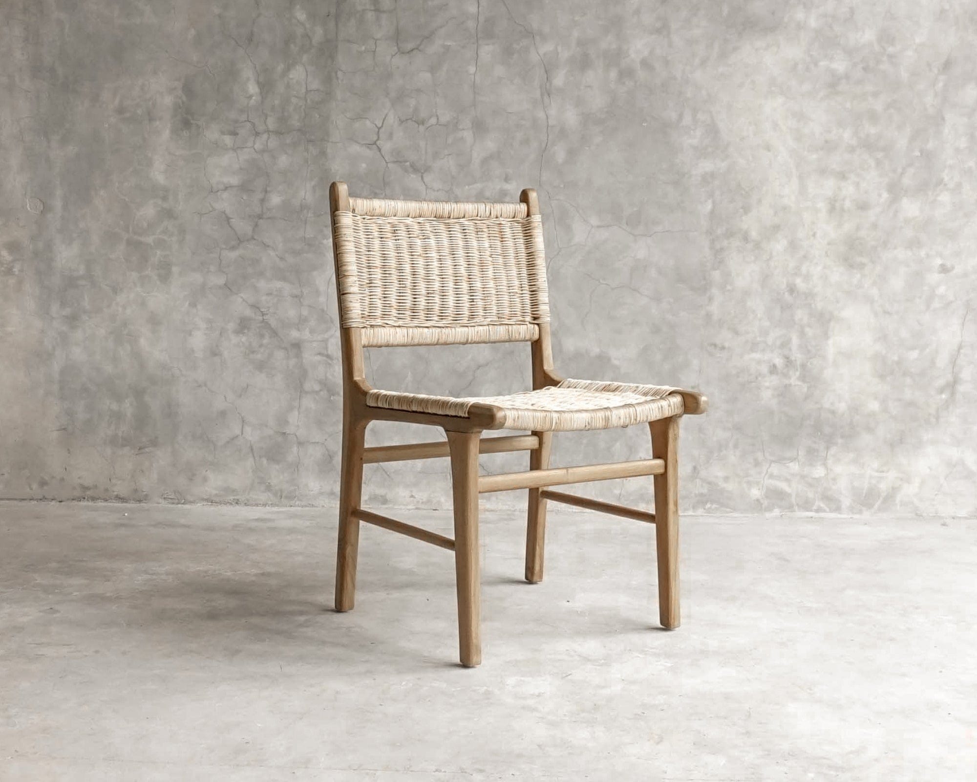 - Design: The understated design of the Husk Dining Chair allows it to effortlessly complement various settings. Featuring a solid teak wood frame and natural rattan seat and backrest, this chair seamlessly blends traditional woodcraft techniques with modern comfort.