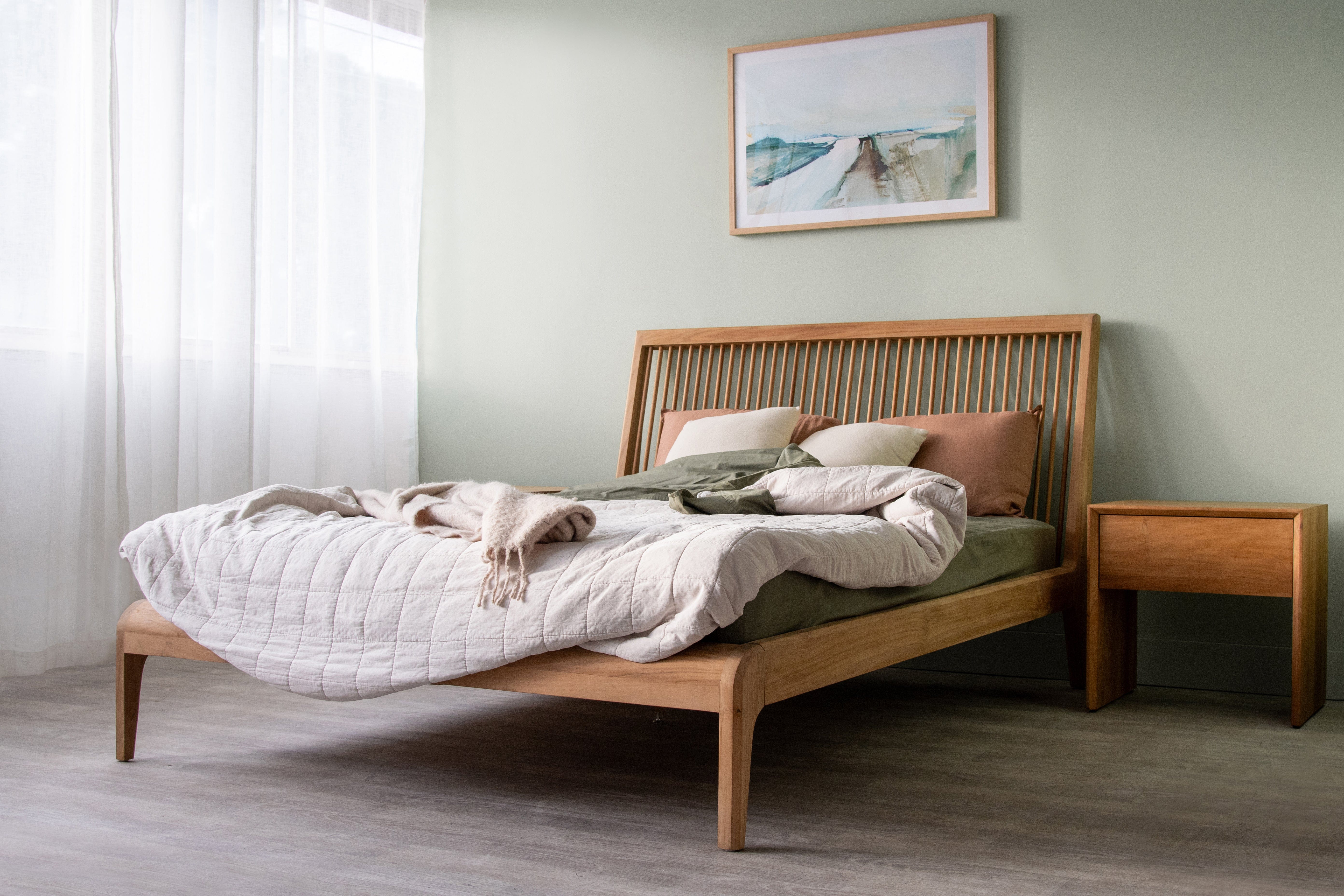 The Spindle bed is part of the Jodoh collection, the Bahasa word meaning soulmate. Its soft curves and airy design sit low to the floor allowing the bed frame to float above the floor and blend into the room without it being an overbearing object. This in turn creates space within the room.Â