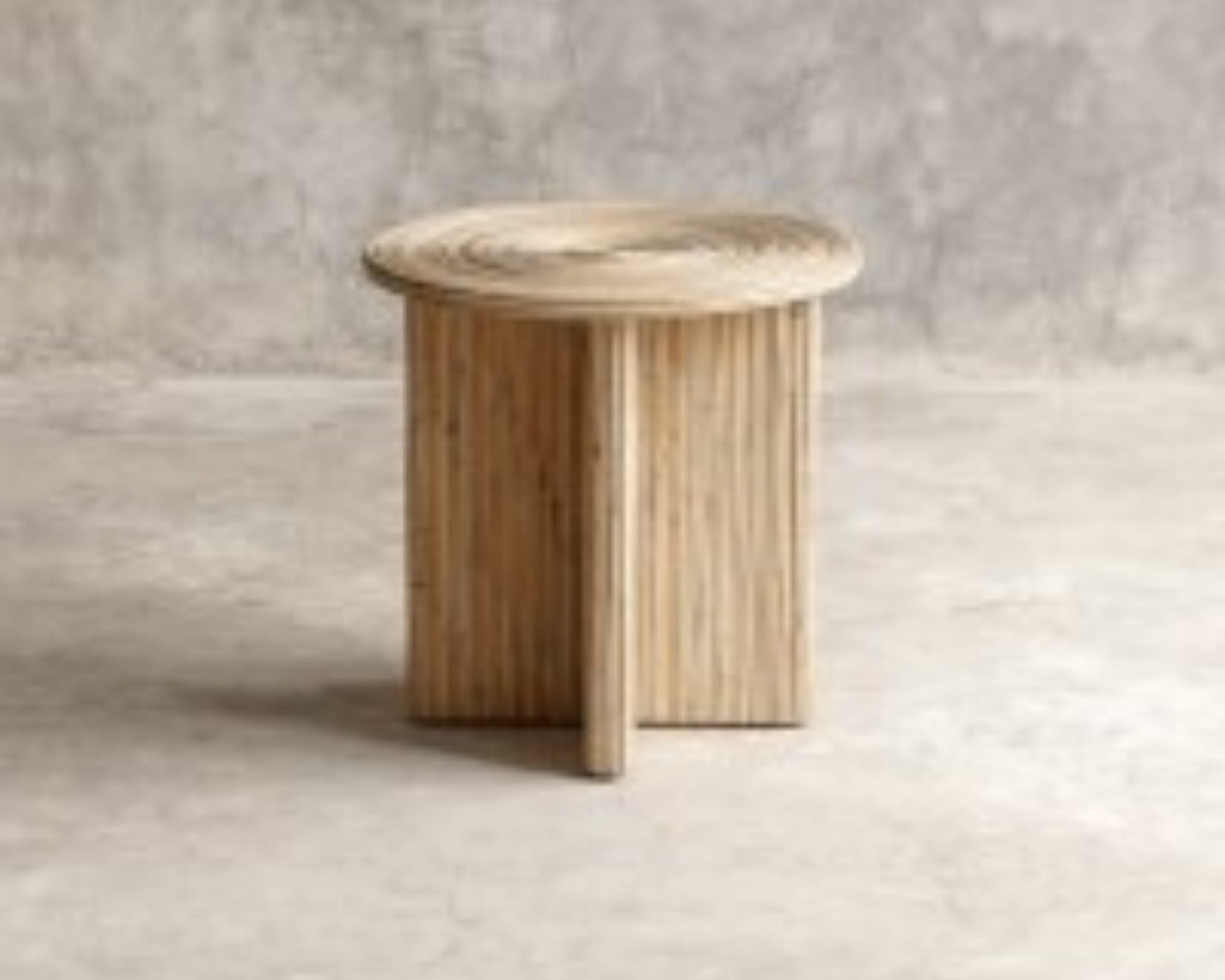 The Kala side table blends contemporary style with coastal boho essence. It consists of an MDF frame with rattan overlay, showcasing the natural grains and texture of rattan. The tabletop sits on a cross base frame, enhancing its stability and style. The soft, undulating surface of the tabletop emphasizes the natural beauty and versatility of rattan, making it a standout piece in any living space.
