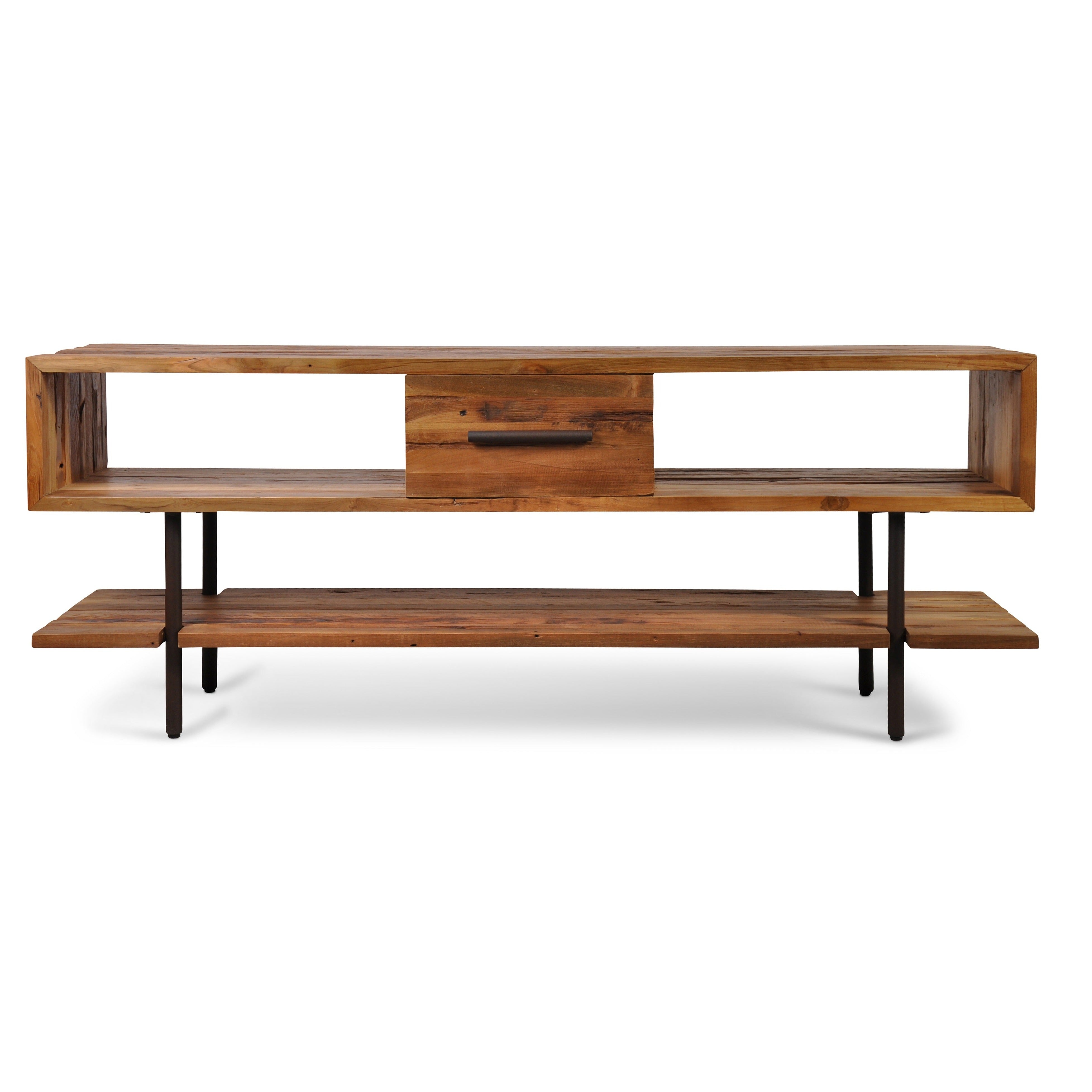 The Kali TV Console is made from recycled Teak sanded smooth with a slight distressed natural finish. The powder coated metal frame is finished in a textured black gold mottled colour finish. The unit consists of an open bottom shelf, two open box storage compartments either side of 1 drawer with the open tabletop. Naturally occurring knots, burrs and gnarls maybe evident and are not considered as faults. Functional and versatile, the Kali TV Console will suit most decors.