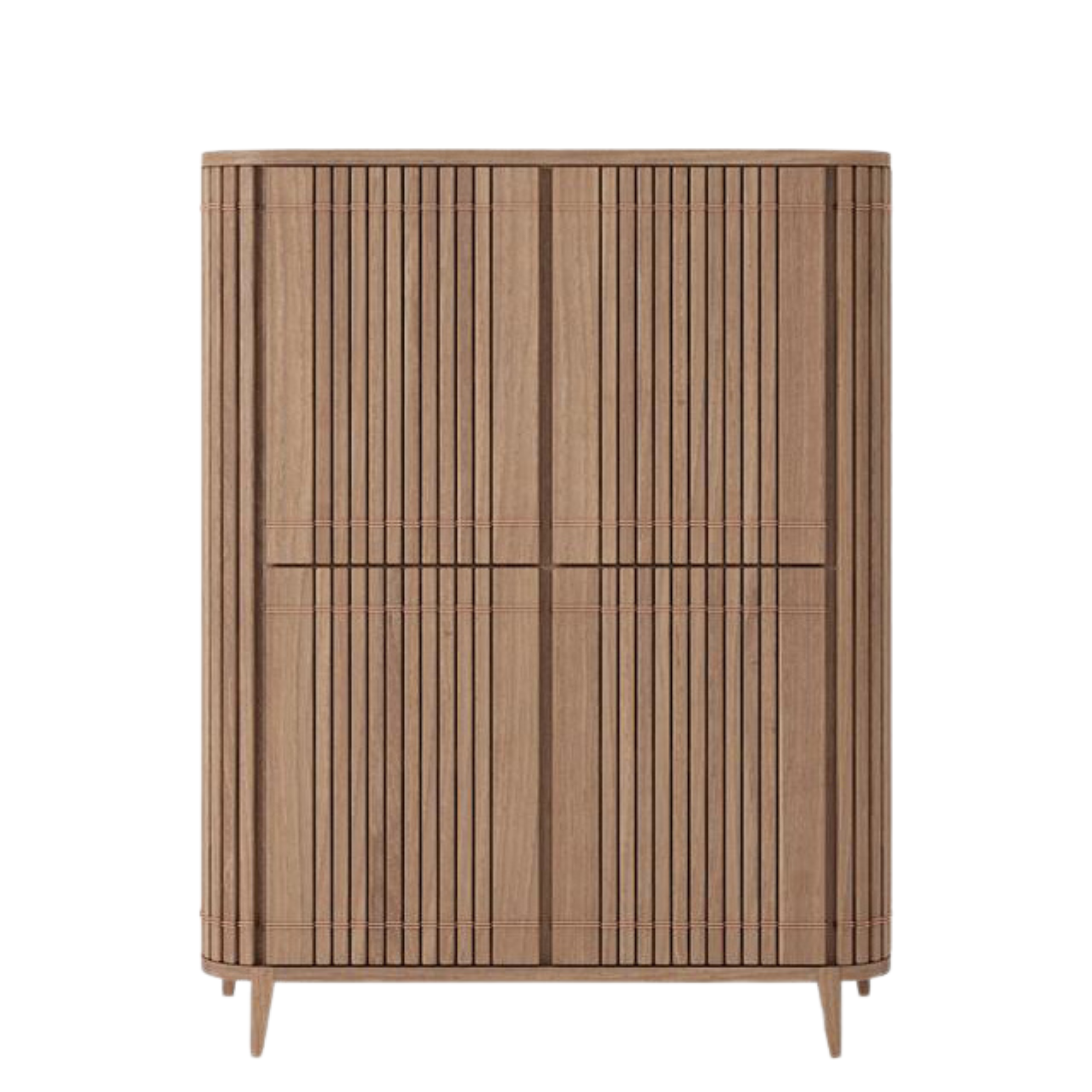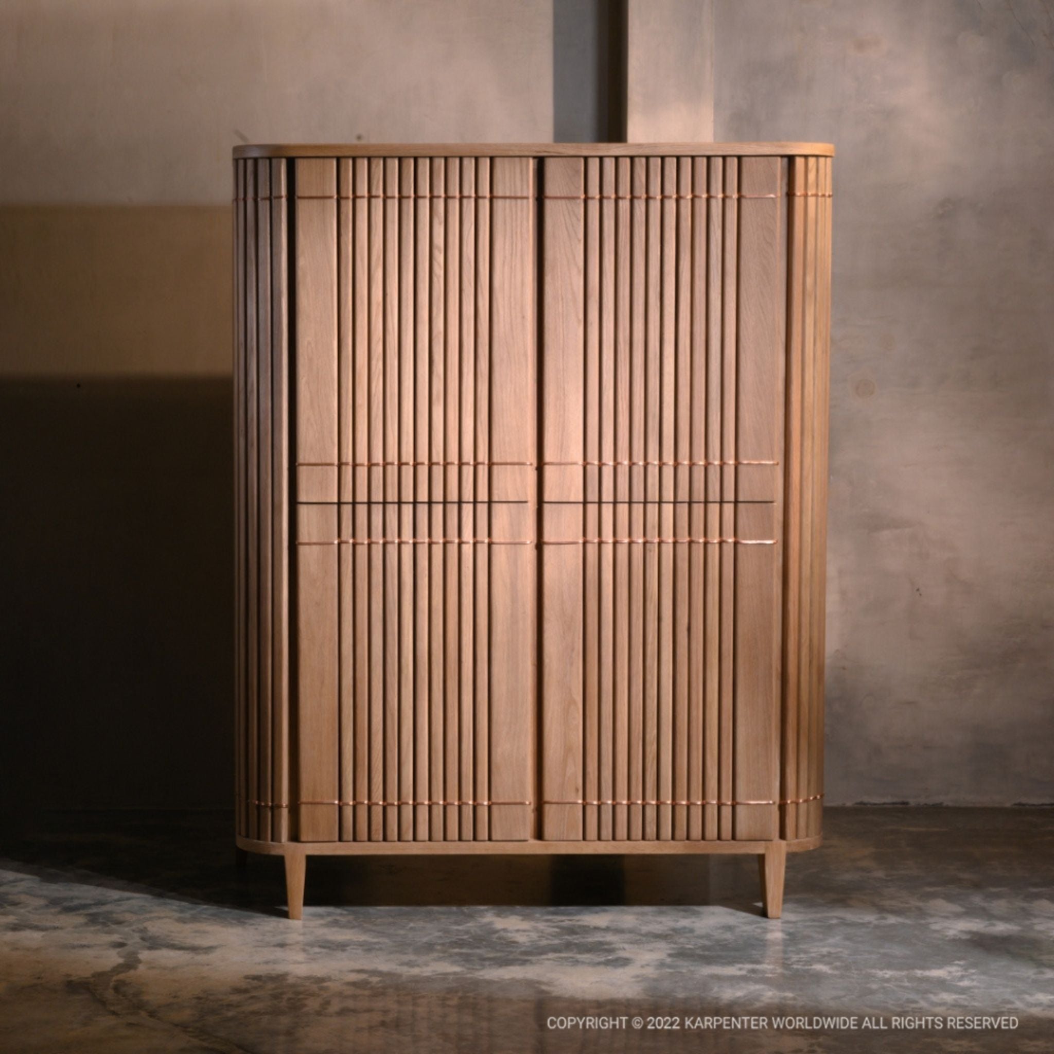 This brand new Koppar range from Karpenter has been highly anticipated. This beautiful cupboard features a fresh modern design with smooth curves, a lovely slatted finish and finished with beautiful copper accents. This particular piece has 4 soft closing cupboard doors that conceal a split shelving system which can be made into 4 separate voids.