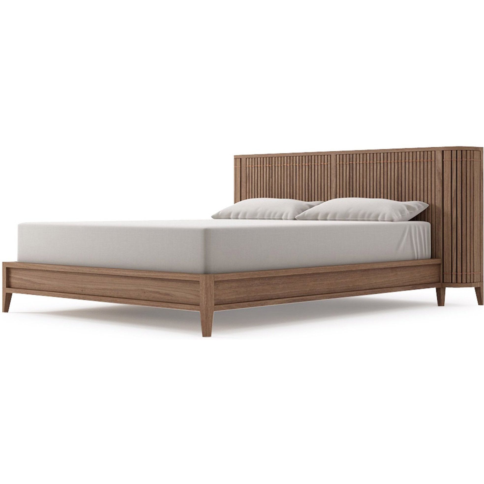 A standout feature of the Koppar Bed is its uniquely designed headboard, which discreetly conceals three deep storage shelves behind its elegant slatted design. Perfect for storing quilts, pillows, and other essentials, this hidden storage keeps your space organized without compromising on style. The bed is available with or without storage, offering flexibility to suit your needs.
