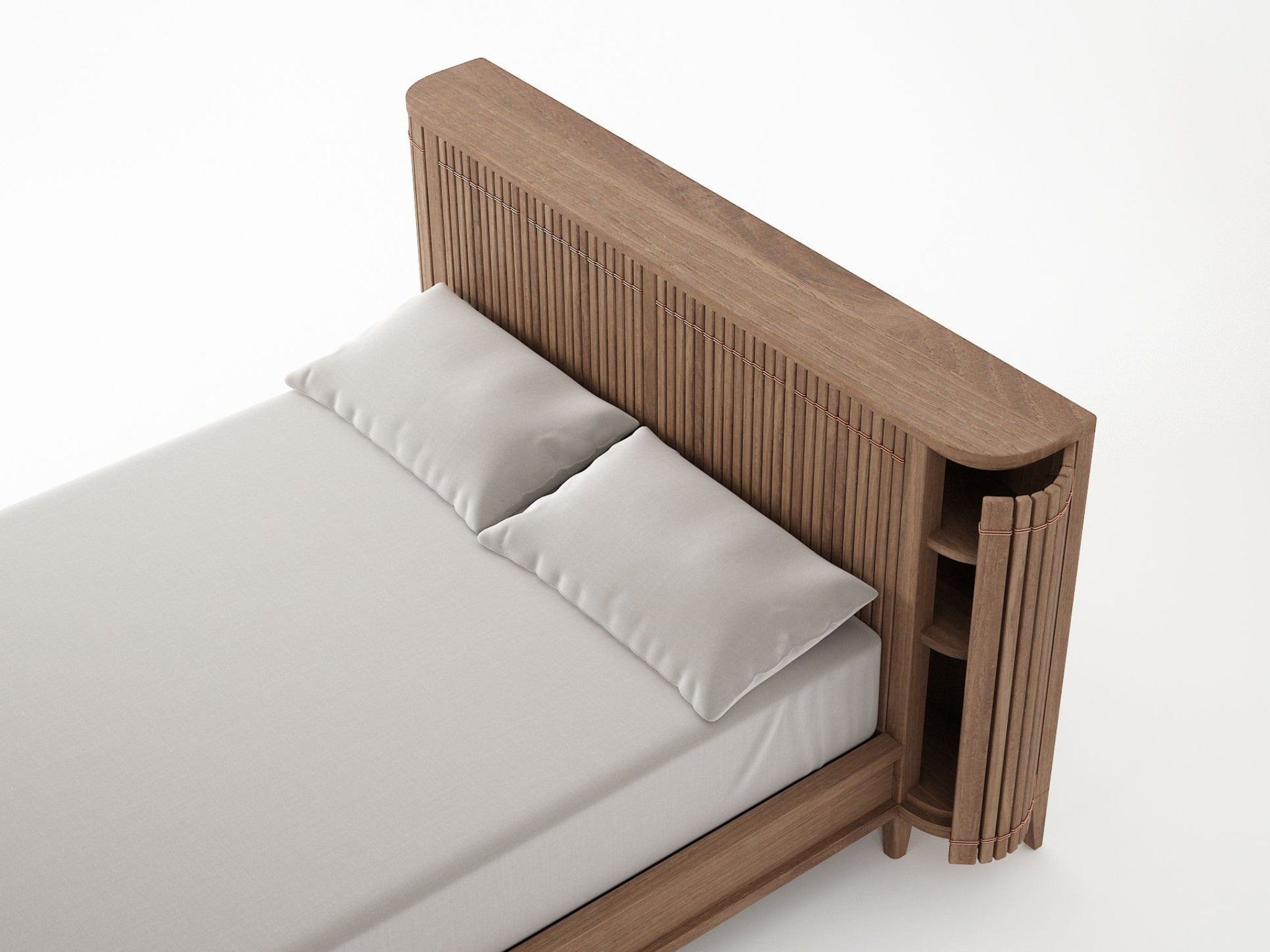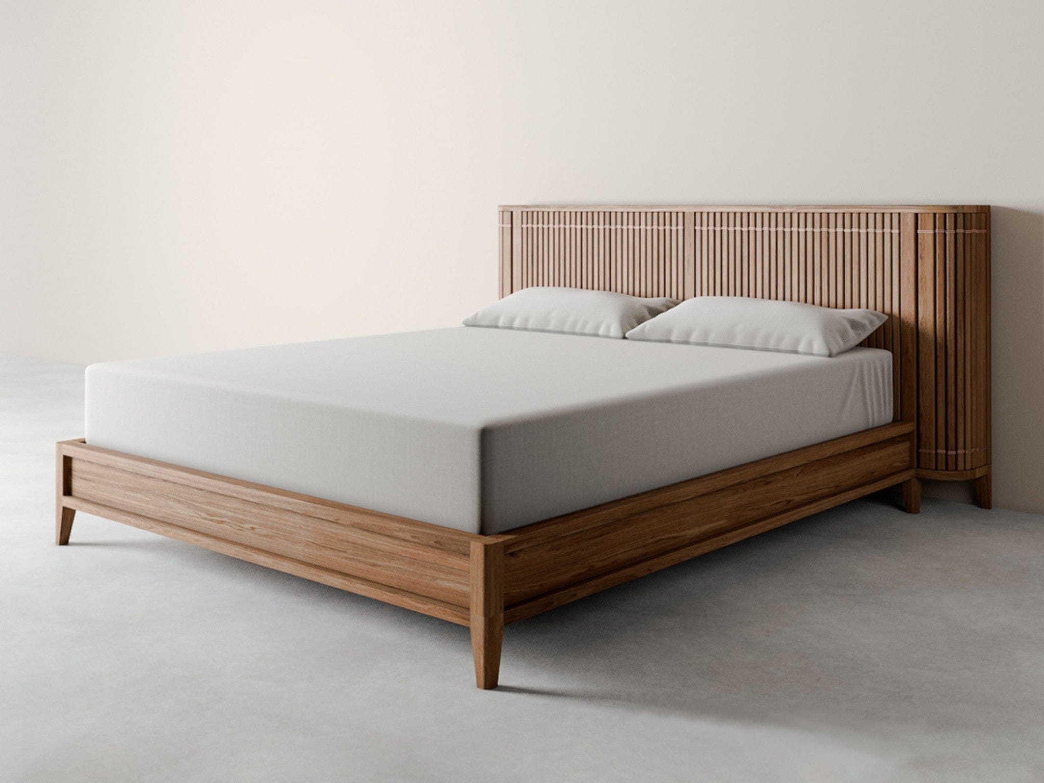 - Hidden storage in the headboard: Three deep shelves discreetly tucked behind the slatted design, ideal for storing quilts, pillows, and more. Also available without storage for those who prefer a simpler design.