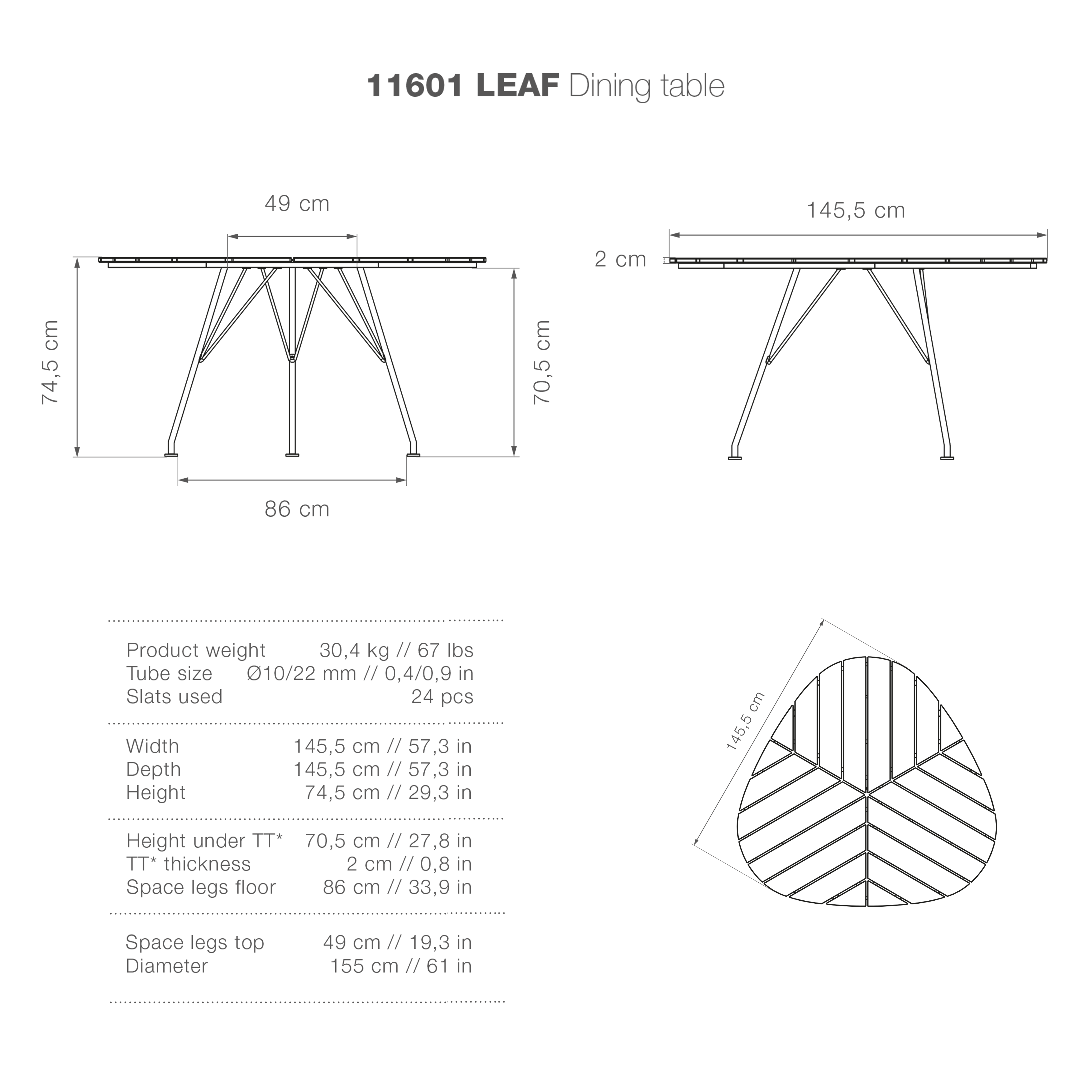 The powder coated steel frame consists of 3 central legs all supported centrally to the tabletop. The slatted bamboo lamellas float on top of the metal frame, and are slatted angled central to the tabletop. This gives the appearance of veins in a leaf whilst allowing water run off.