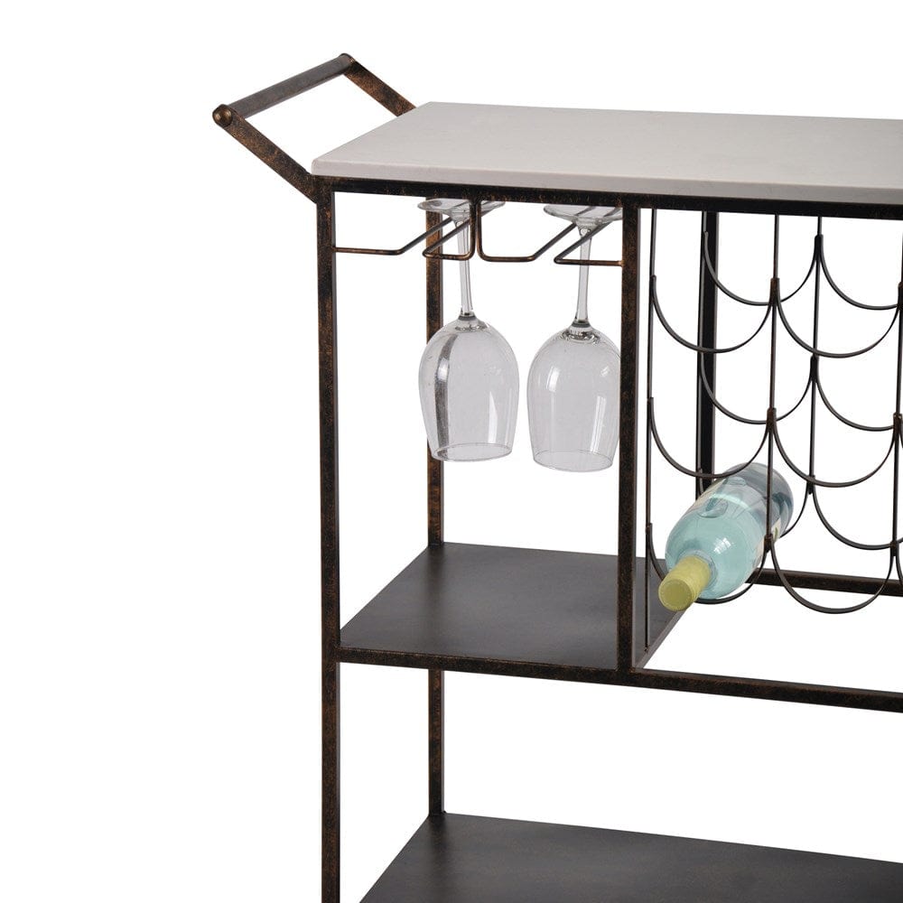 The Luxe Drinks Trolley consists of a metal frame with a faux white marble service top, and four castor wheels. The metal is a mottled two tone black/rust gold colour tone, and consists of two wine glass hanging racks, and two shelf compartments. The bottom shelf is 25cm height clearance & the upper shelf compartment is 33.5cm to the base of the glass racks. There are two lockable castor wheels and wine storage for nine bottles. Compact and functional, it makes the perfect entertainer.
