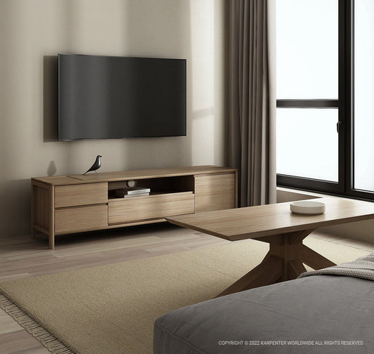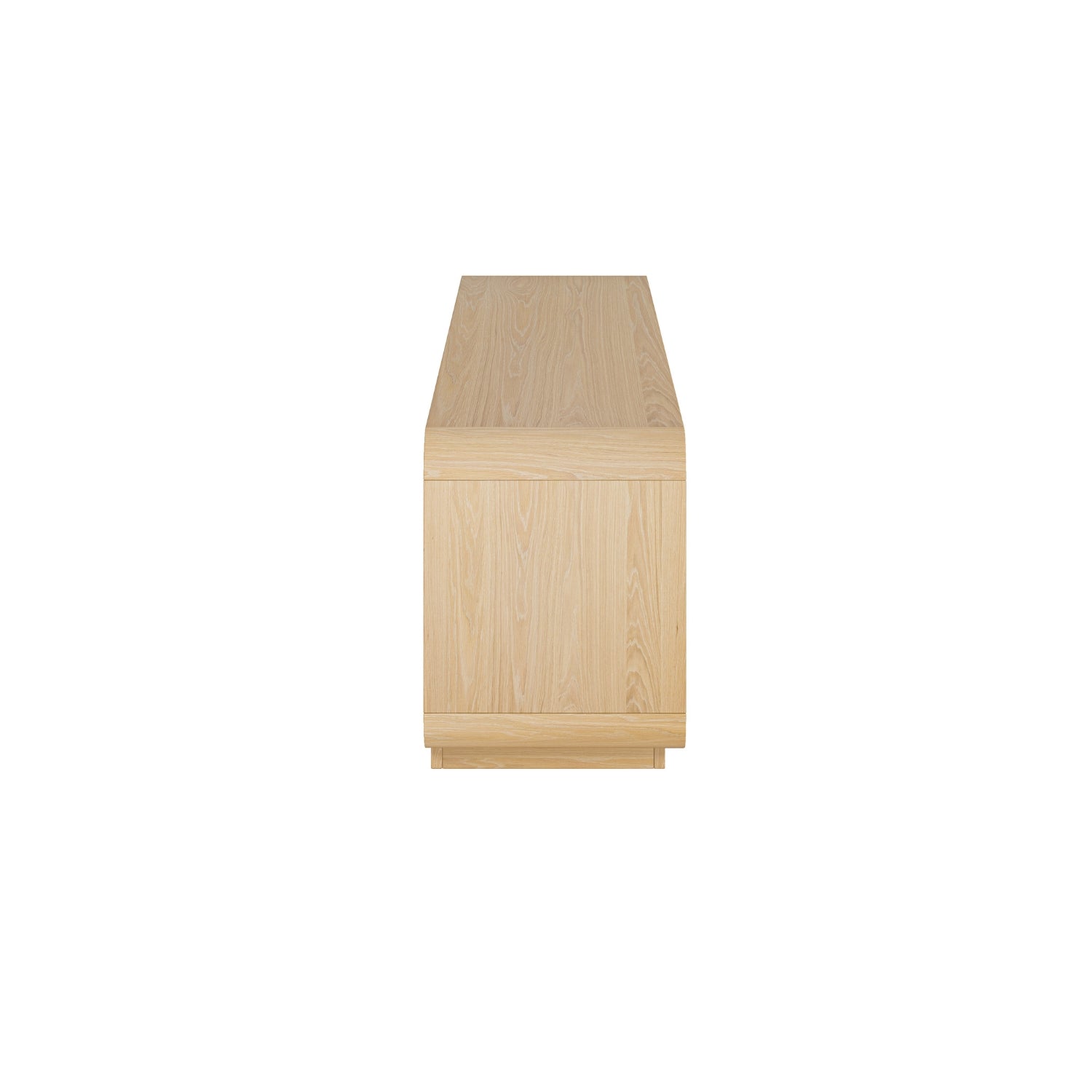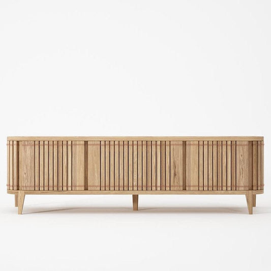 The low, elongated proportions are carefully considered to support televisions and media equipment without overwhelming the space, while concealed storage keeps cables and accessories neatly out of sight. Crafted with a focus on material honesty and balance, the rattan detailing introduces visual rhythm against a clean, minimal frame.