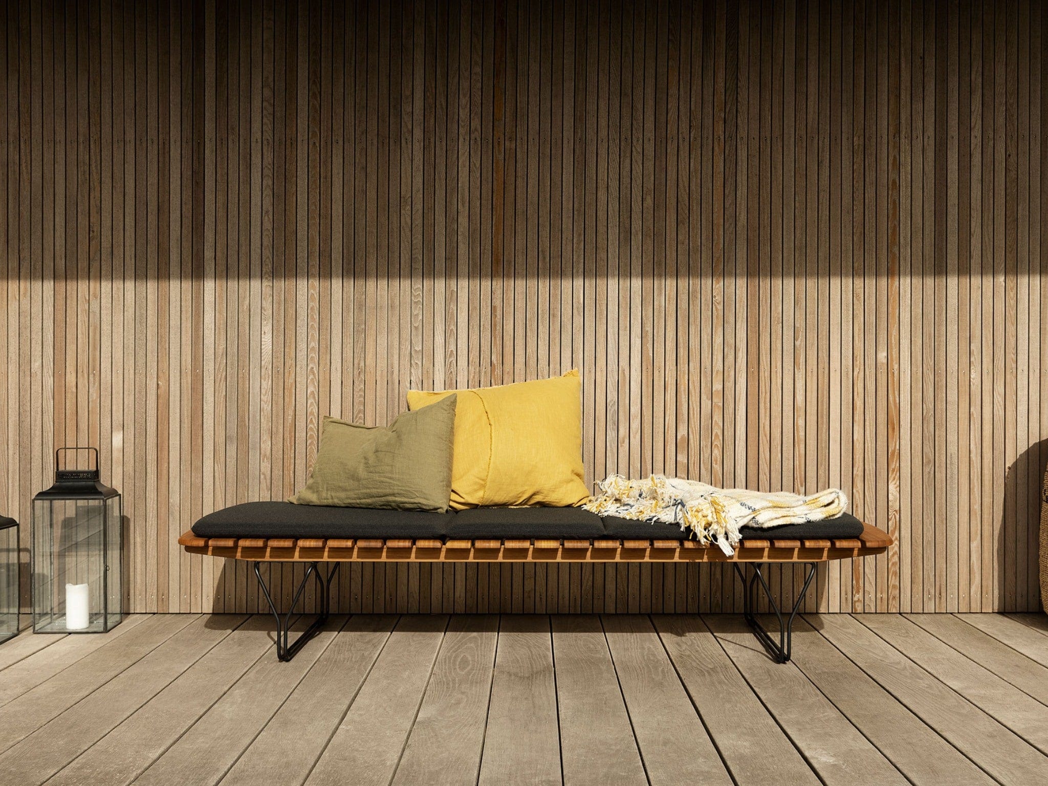 Molo Sunbed is made in bamboo lamellas with a decorative leg construction in powder-coated black metal. The surface and the softly rounded bamboo lamellas combined with the metal construction lead the thoughts towards a pier and the relaxed atmosphere by the sea.