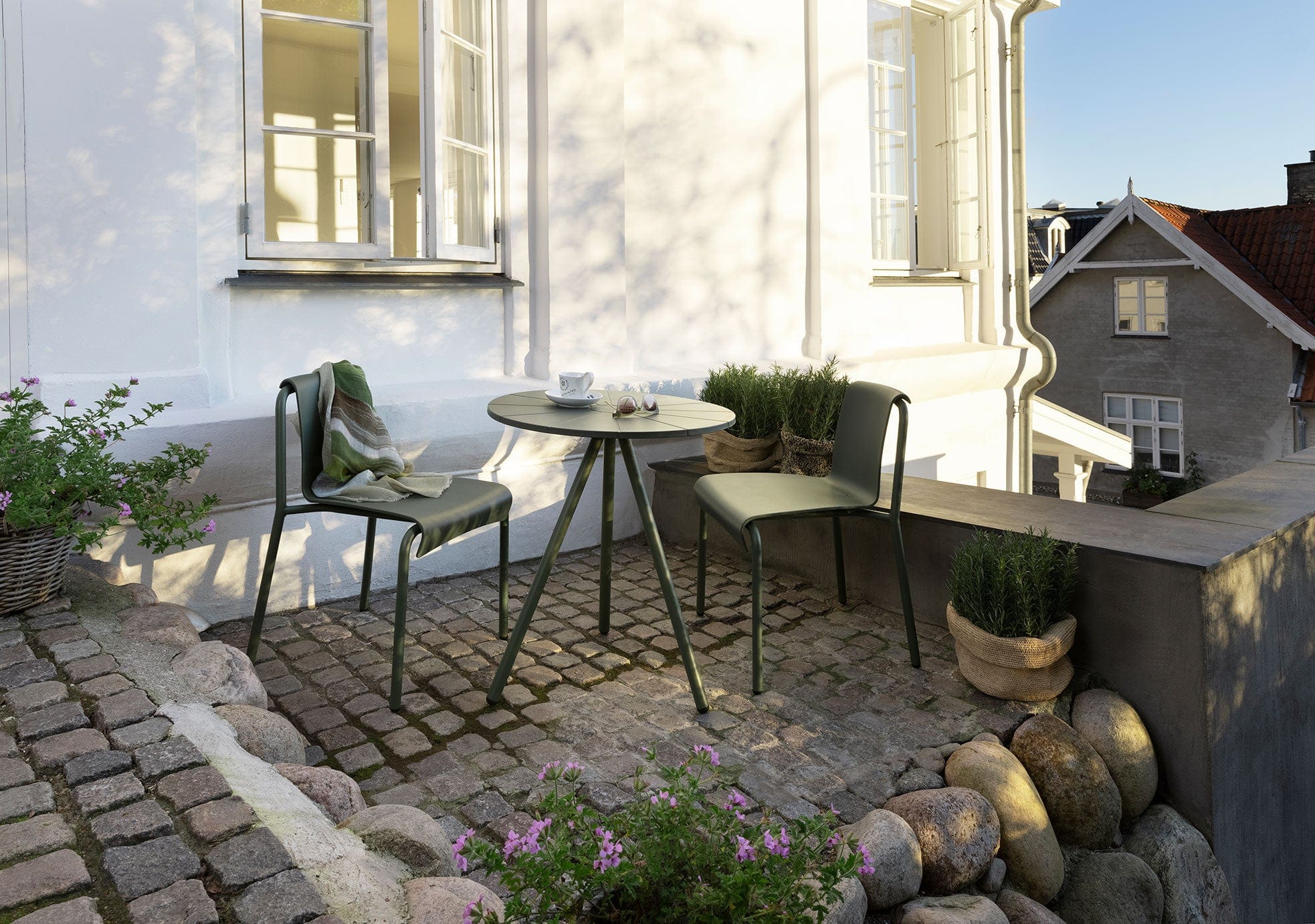 The elegant contours of the table's design evoke the image of a wave gently washing over the beach. Named NAMI, which means "wave," this sophisticated garden table embodies organic expression. Inspired by the forces and lines of nature, it seamlessly integrates into outdoor settings, thriving in wind and weather. NAMI consists of powder-coated steel frames with beautifully molded plastic tabletops. The plastic parts are made in Denmark from 97% Danish household plastic trash, with 3% color pigment added.