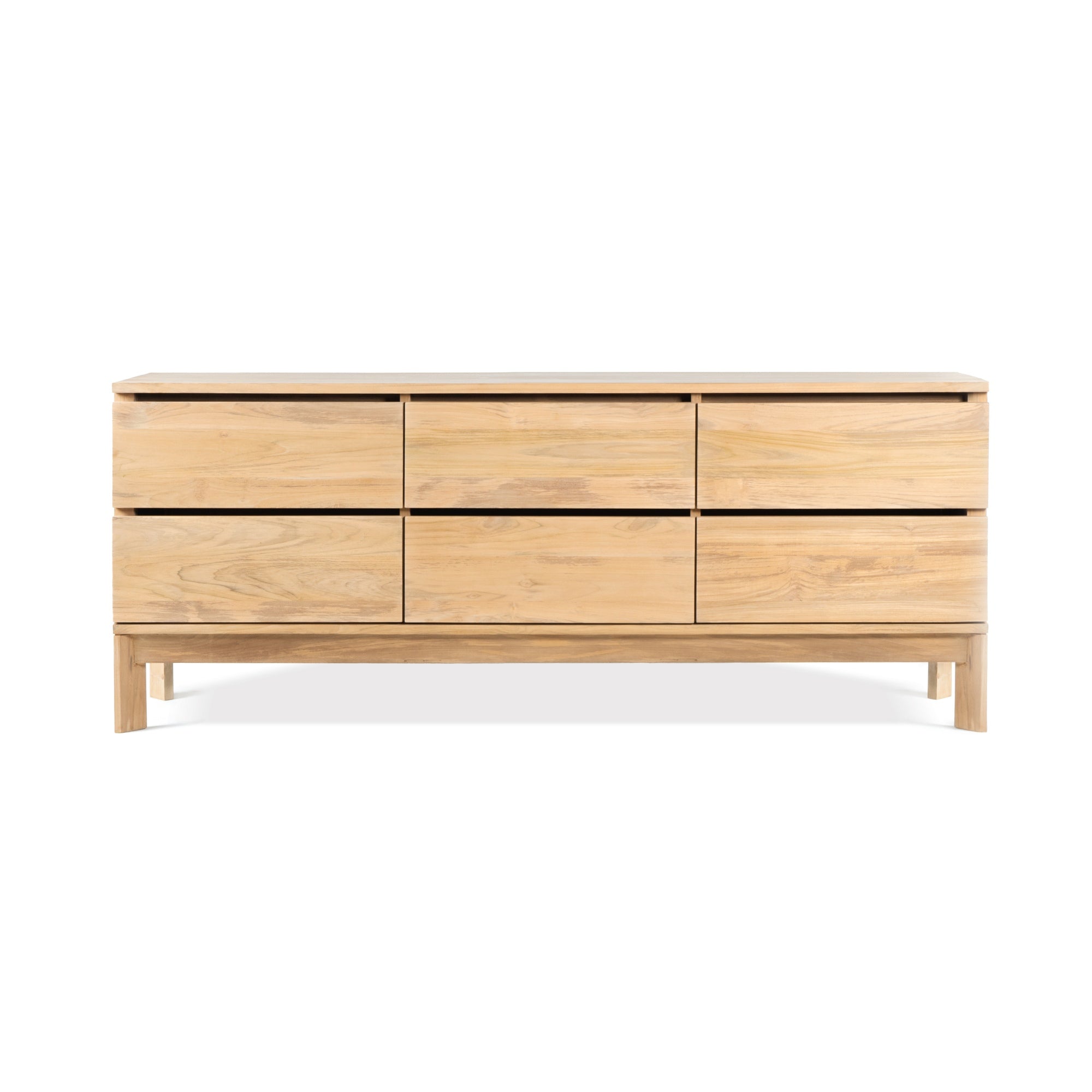 The Nirmolo Chest of Drawers features 6 generous drawers with soft close mechanism set atop a sleek angle profile leg base set at a 45 degree angle which provides a simple contemporary design element. The Nirmolo Chest of Drawers is raised higher to reduce bending down for the bottom drawers. The smooth contours of the sustainable Teak timber gives a tactile nature to the unit.
