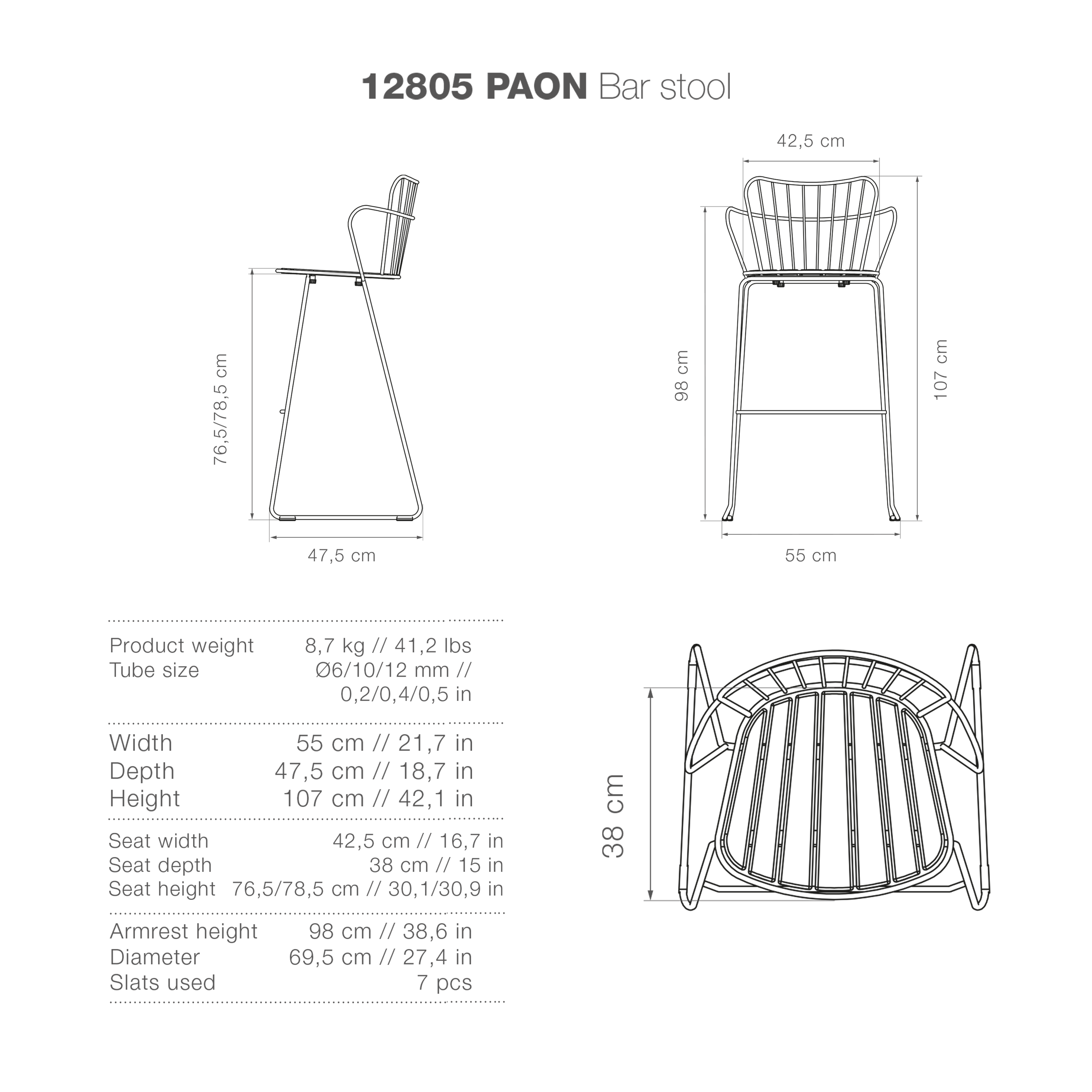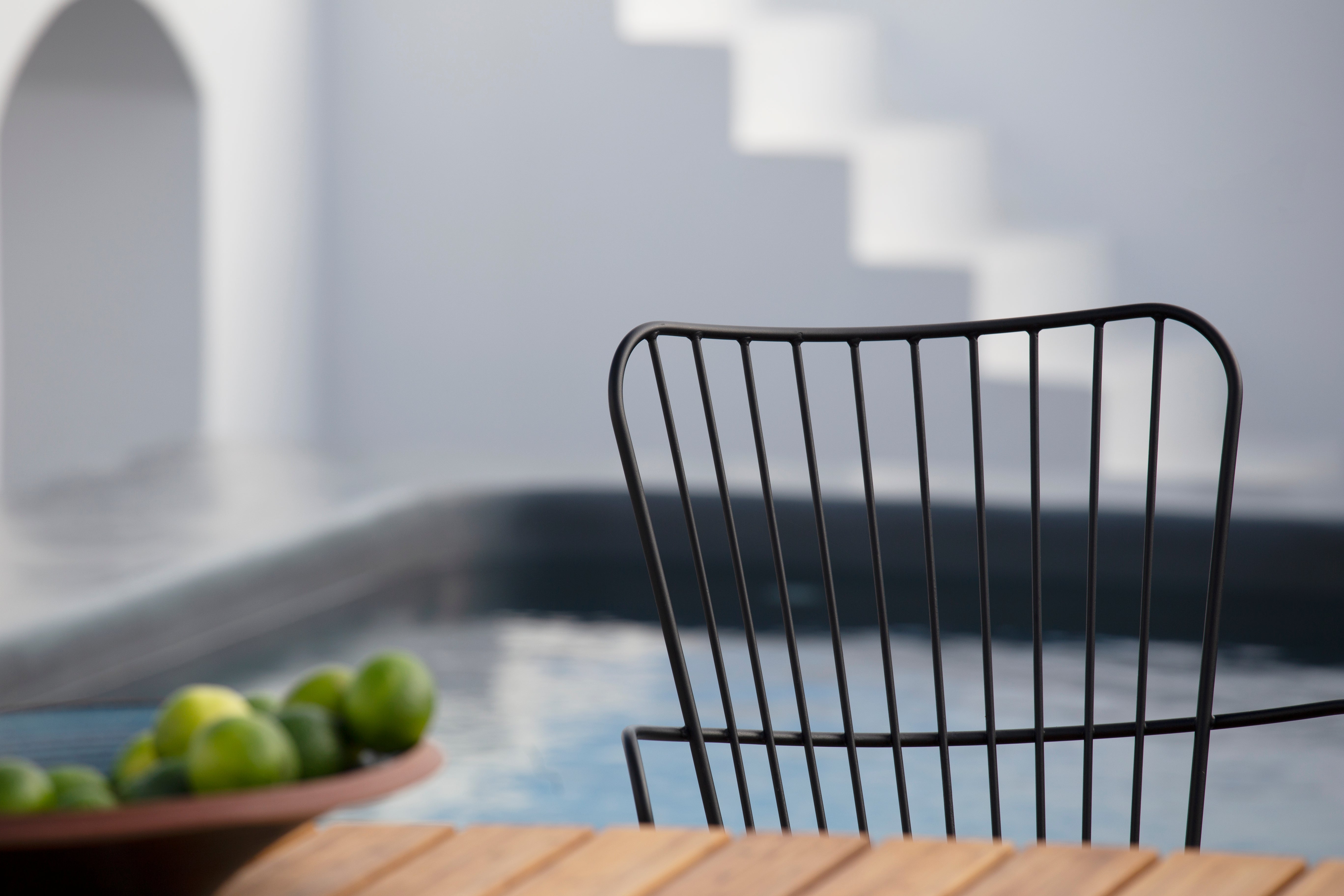 The PAON line consists of a Dining chair, Lounge chair, Rocking chair, a two-seater Bench and a Bar chair. Made in powder-coated steel with bamboo lamellas.