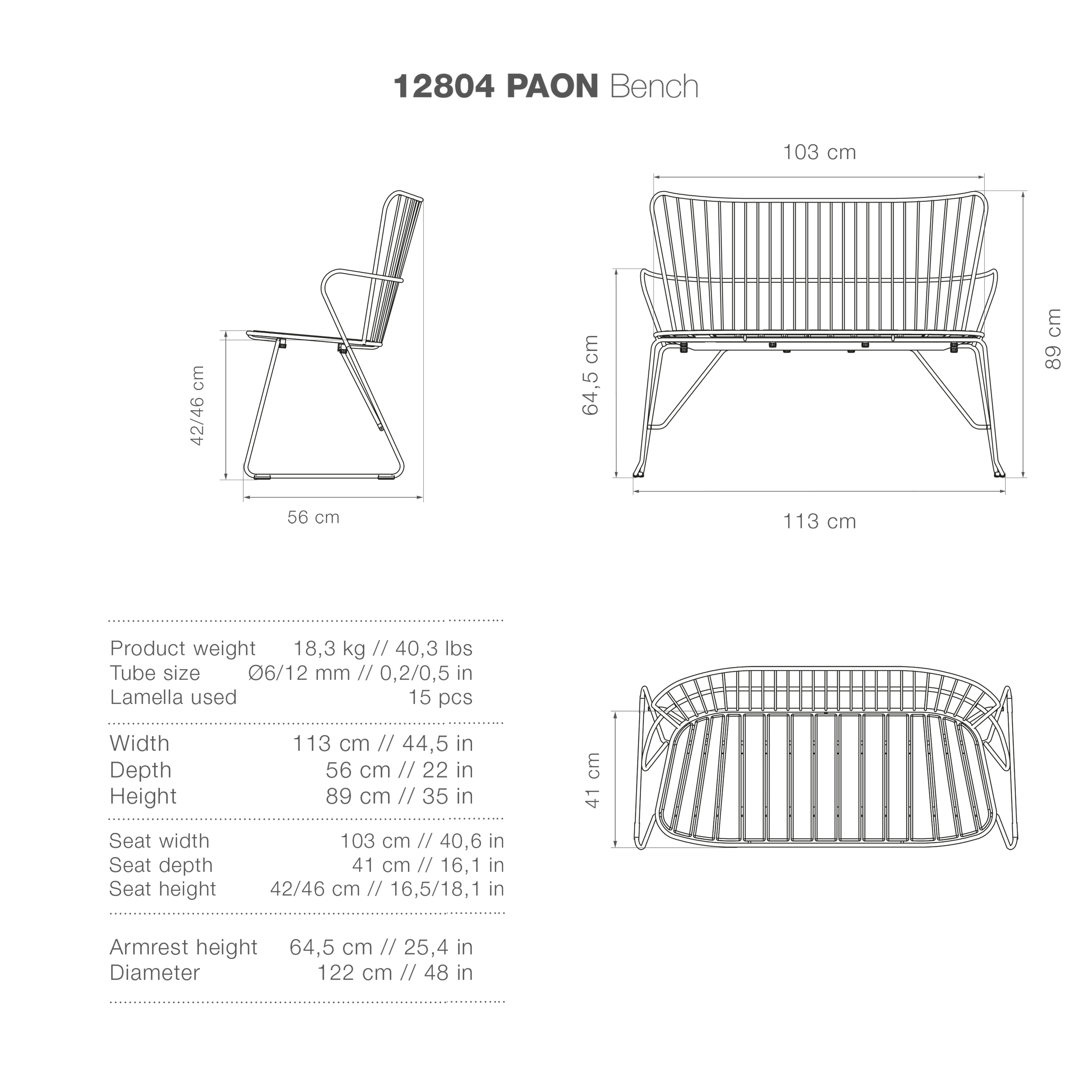 The PAON line consists of a Dining chair, Lounge chair, Rocking chair, a two-seater Bench and a Bar chair. Made in powder-coated steel with bamboo lamellas.
