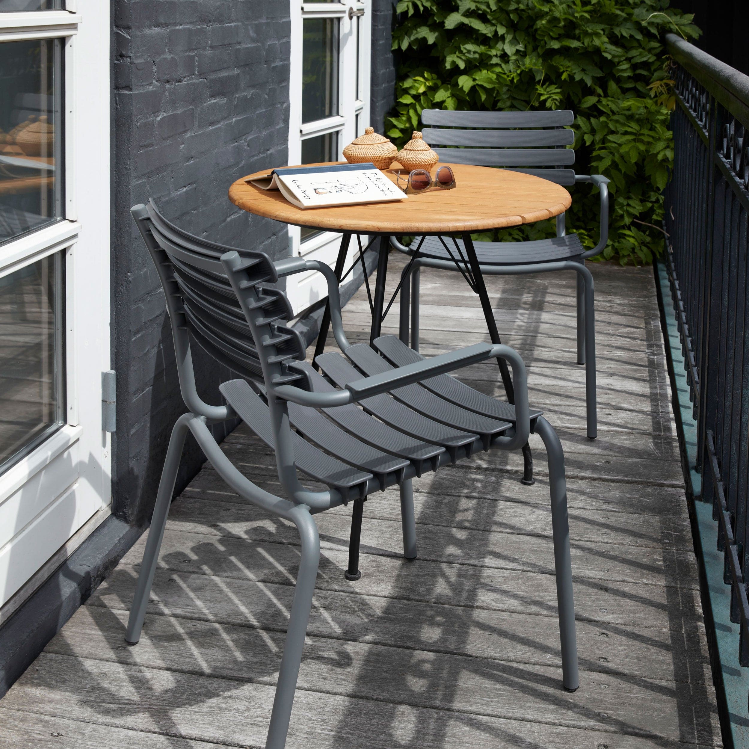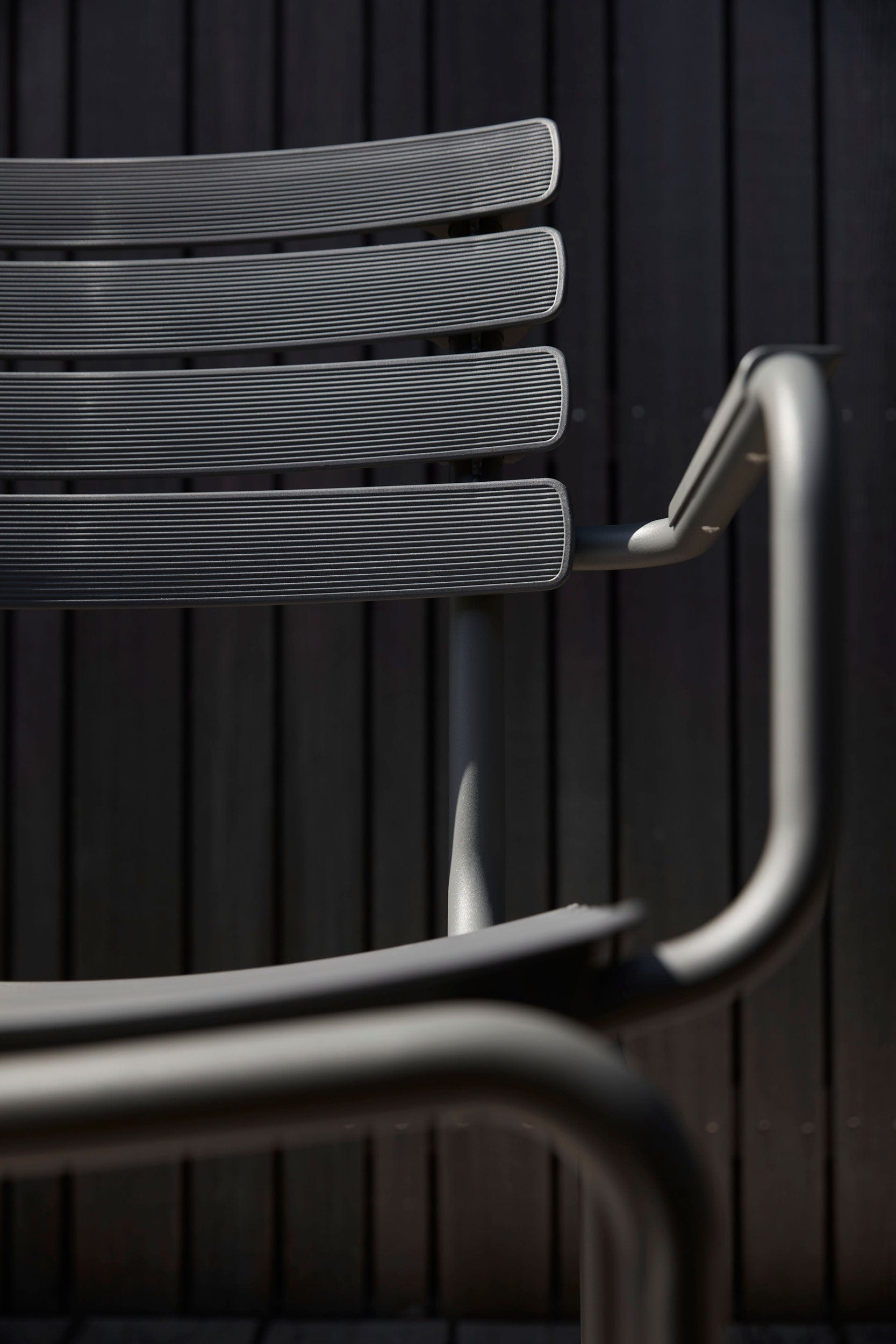 ReCLIPS dining chairs come in 4 mono colors with the choice of adding armrests in bamboo. the aluminum frame combined with the UV-protected plastic lamellas, keeps the maintenance to a minimum.