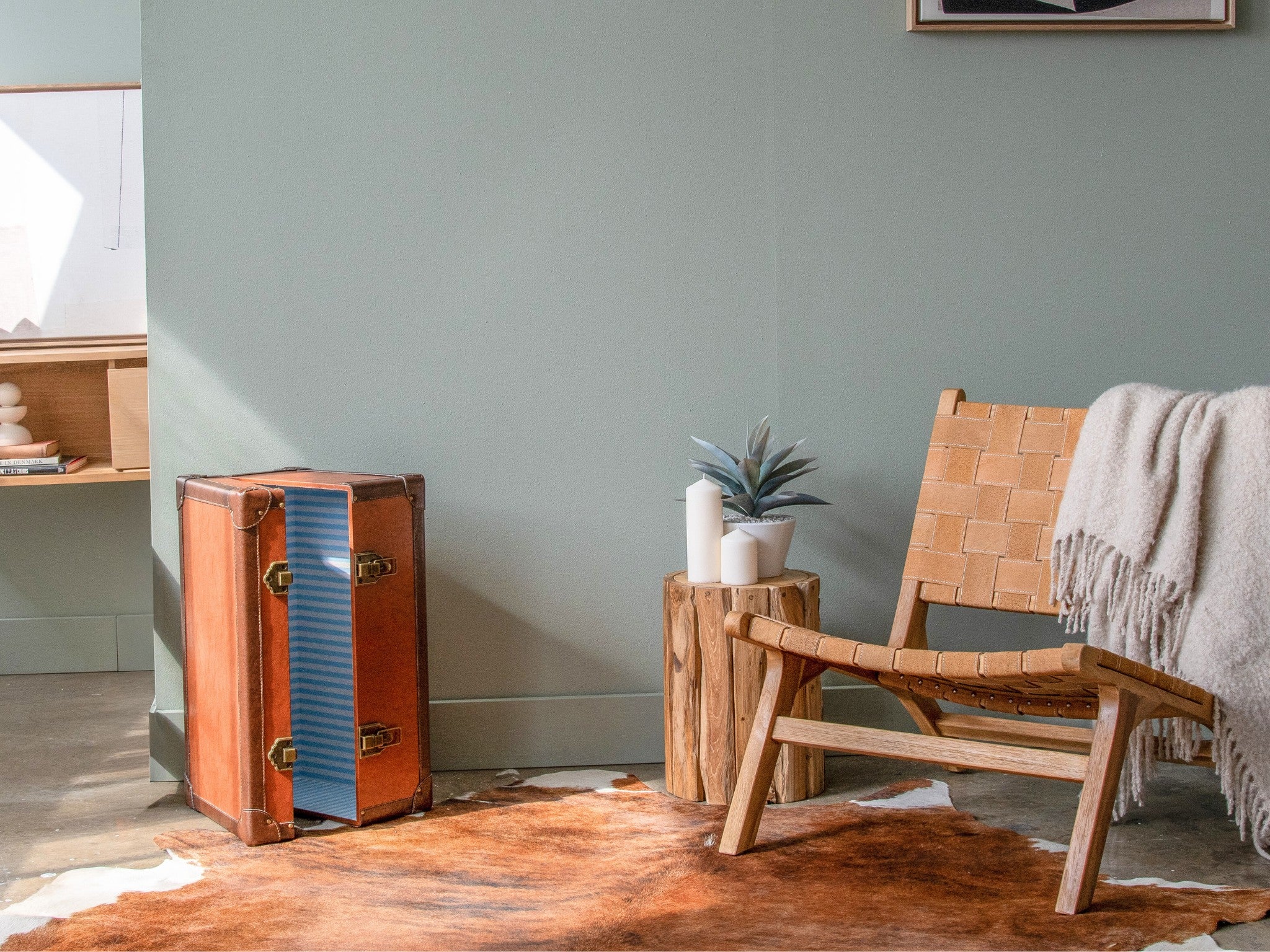 This nostalgic suitcase of a bygone era adds a little adventure to your interior space, whilst making a great storage case to declutter. Great for kids rooms, utility rooms, or to store magazines, knitting etc. The suitcase is made with solid mdf frame, faux leather outer lining with additional trim lining, and metal stud rivets, hinges & clips. The internal space is lined with licquorice blue & white stripes. The internal dimensions are H17, L 58, D 33cm.