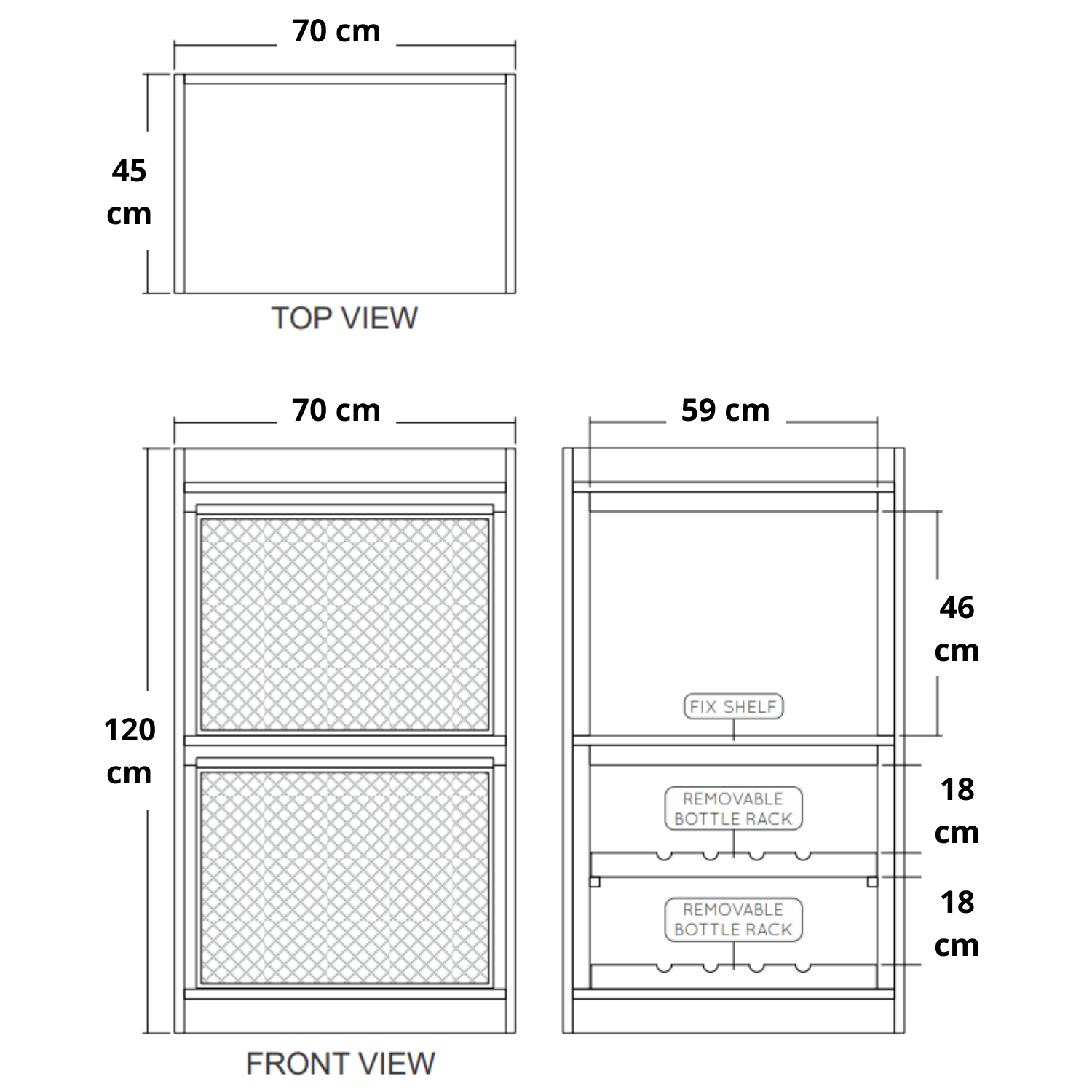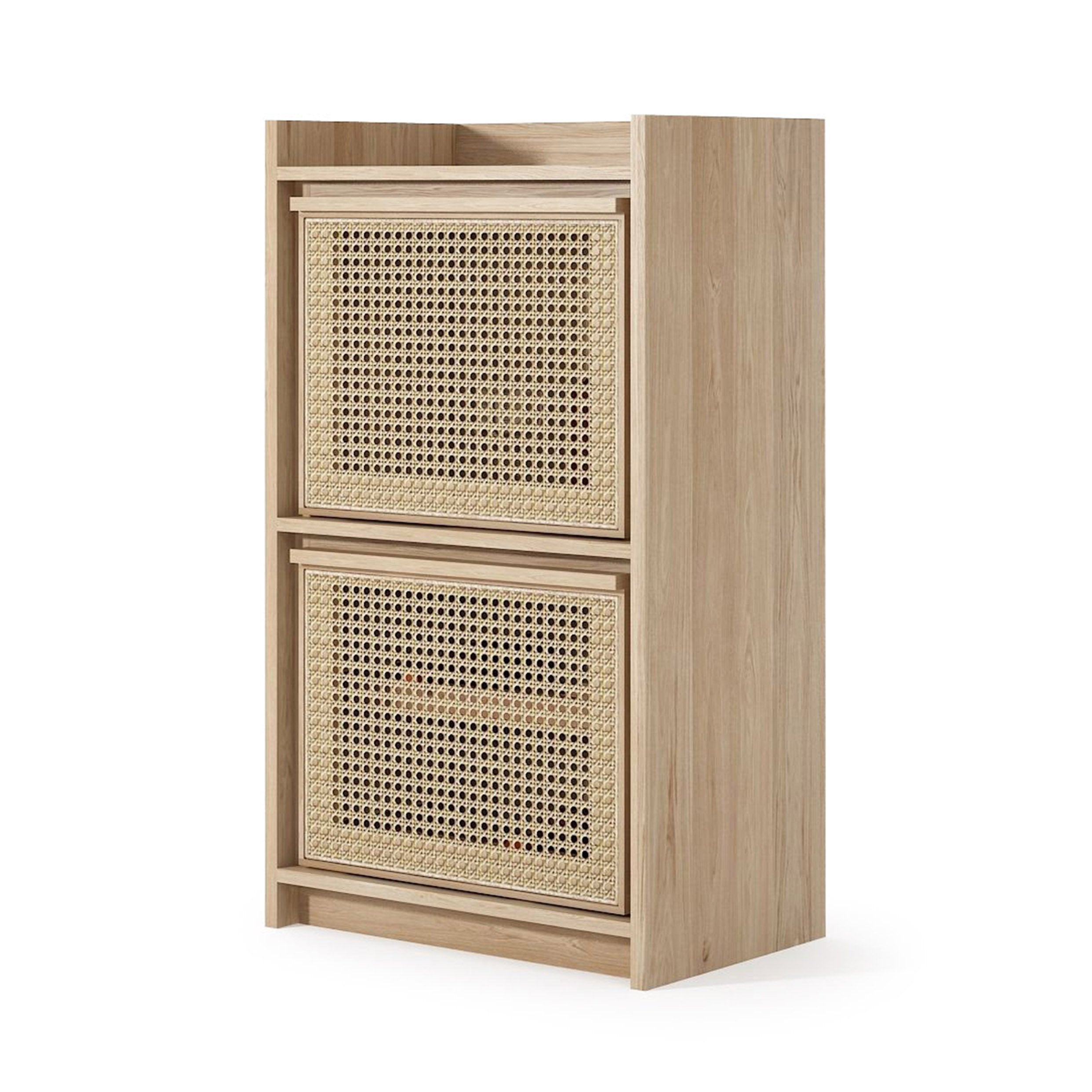 The sleek simple detail of the oak frame combined with woven rattan doors allows good air circulation for storage with two large open compartments. It can be used in the bedroom, living room, office, or that nook that offers vital extra storage. It's compact enough to fit just about anywhere but provides essential storage for today's world.