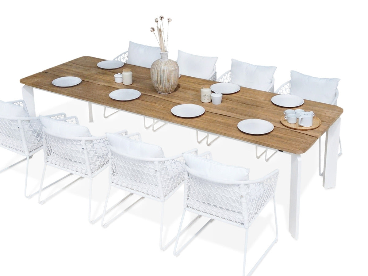 The TITAN Dining Table 240 cm by MAMAGREEN is a bold centerpiece that merges natural elegance with contemporary strength. Its recycled brushed teak tabletop highlights the organic beauty of solid wood, while a robust aluminum frame provides lasting durability and a clean, modern edge.