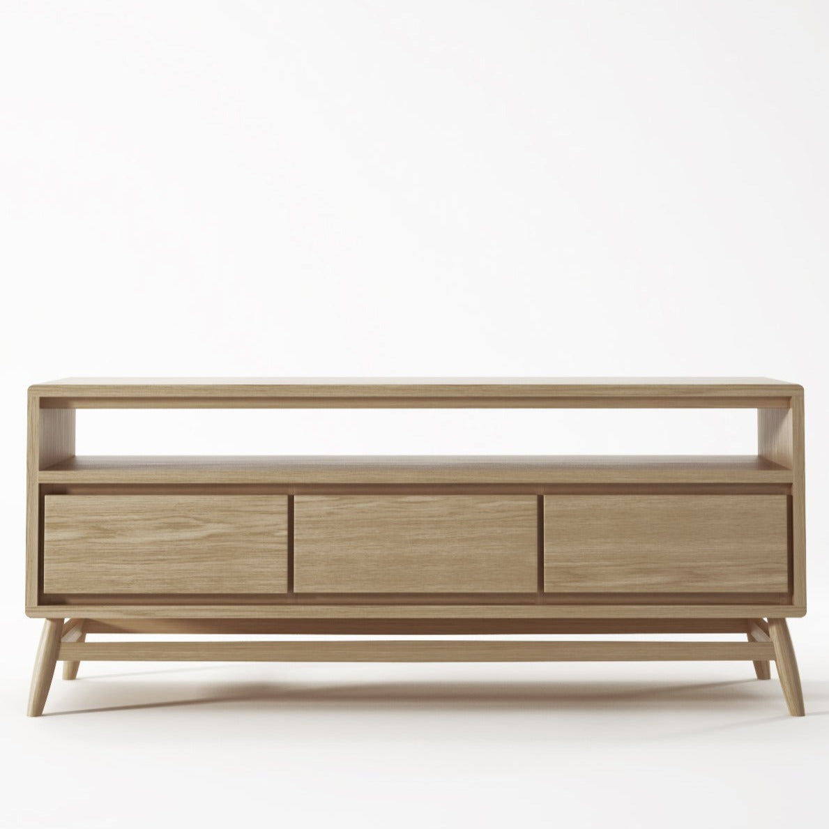 This beautiful TV Unit by Karpenter made with solid European White Oak will allow you to watch your favorite shows amongst a stunning piece of furniture for years to come. With 3 soft-closing drawers, and a media shelf you can stash any unsightly pieces away but proudly display your fabulous media equipment.