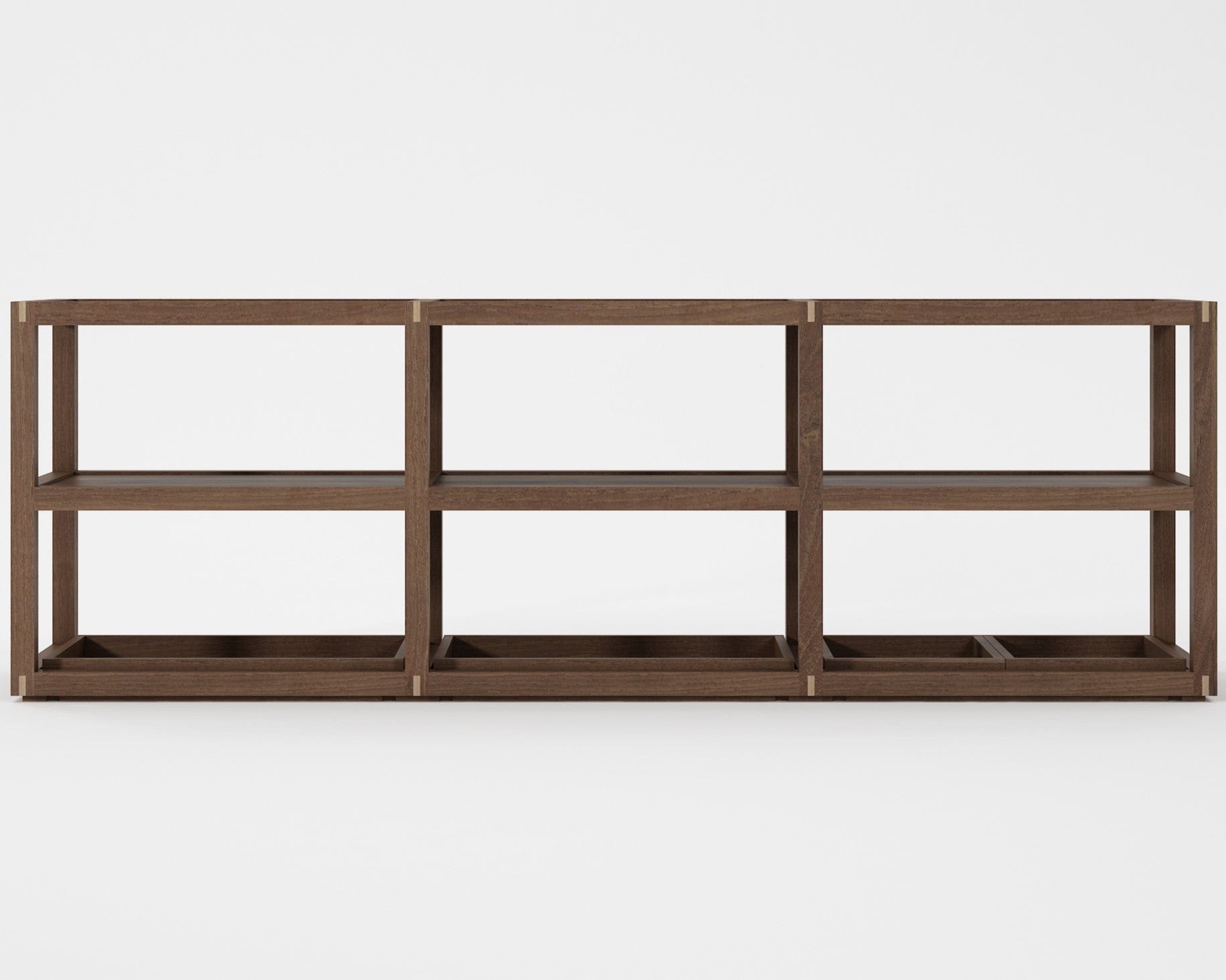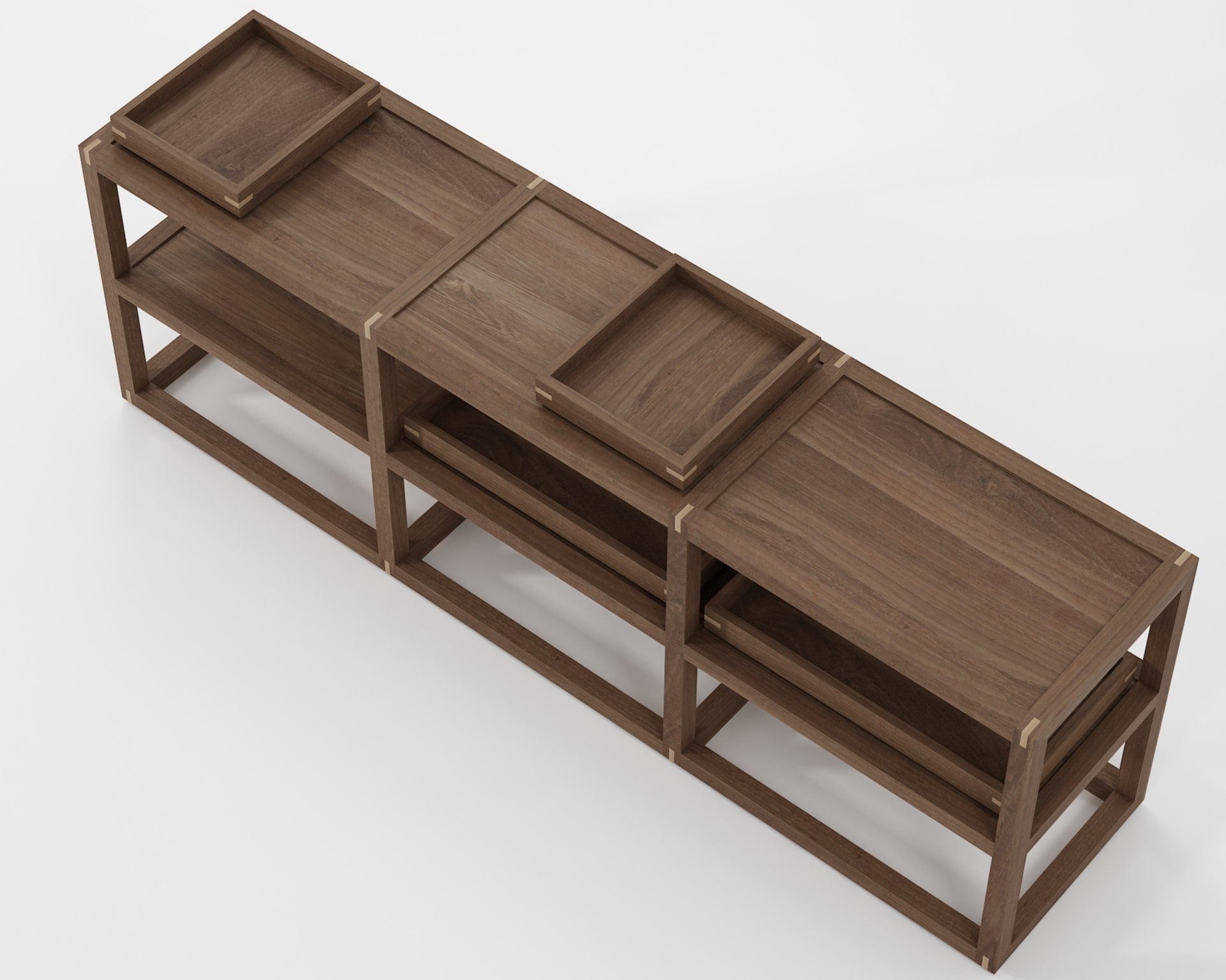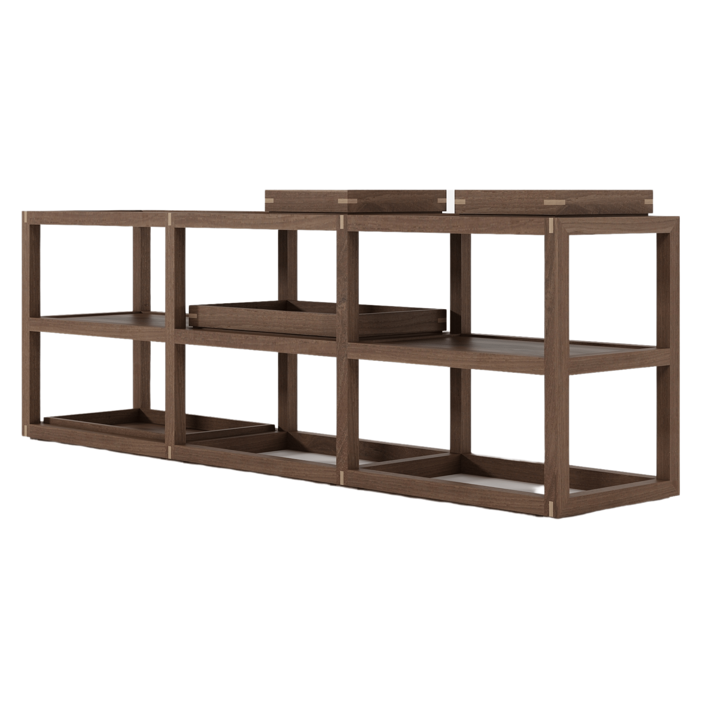 A horizontal rack with 2 small trays and a single large tray made of oak is a piece of furniture or storage solution that allows you to organize and display items on a flat surface. The rack is made of oak wood, which is known for its durability and resistance to rot and decay, and features small teak wood inlays in each of the corners. The 2 small trays and a single large tray provide additional storage space for small items or larger items respectively. This type of rack can be used in a variety of settings, such as in a kitchen, living room, or office.
