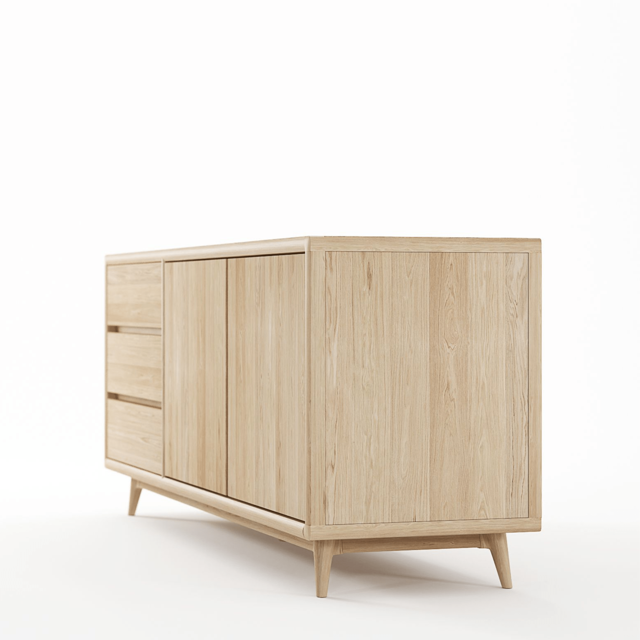 This beautiful sideboard by Karpenter made in solid European White Oak will make a statement in the room of your choice yet offer significant and practical storage. 3 soft-closing drawers, and a dual cupboard with a removable shelf offer privacy for objects that don't need to be on display yet proudly allow the display of items that you may wish to showcase if required. You can choose which colour will best work with furniture already in play.
