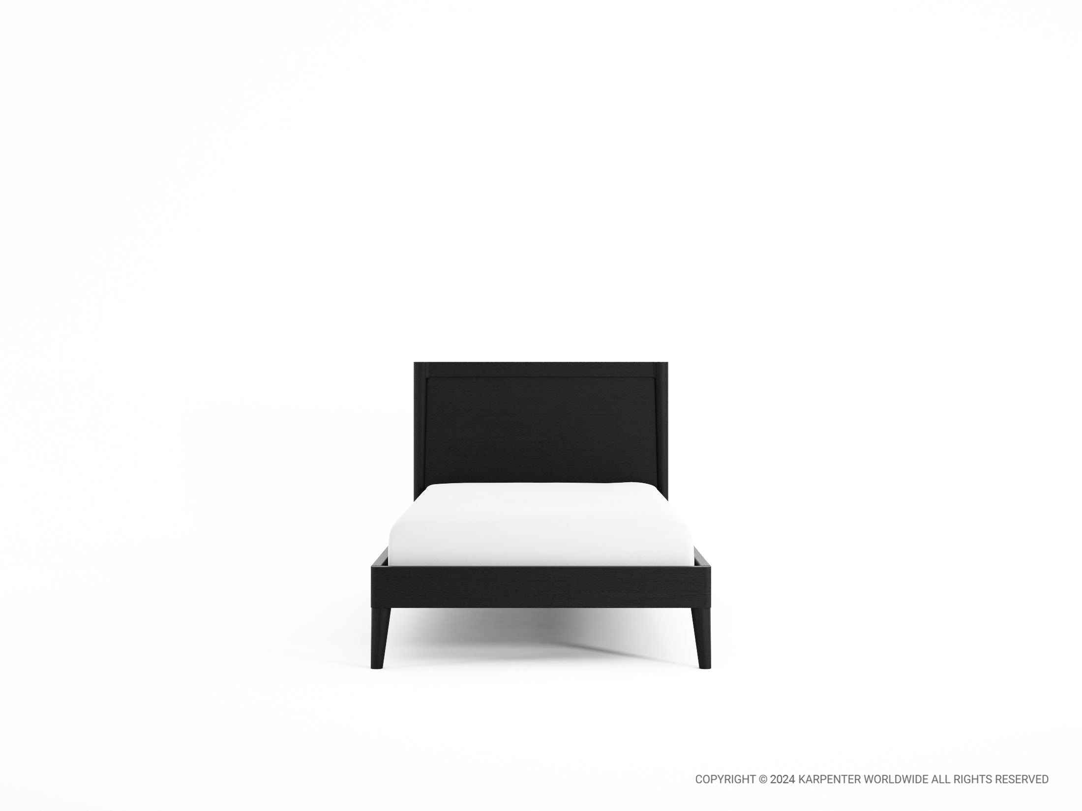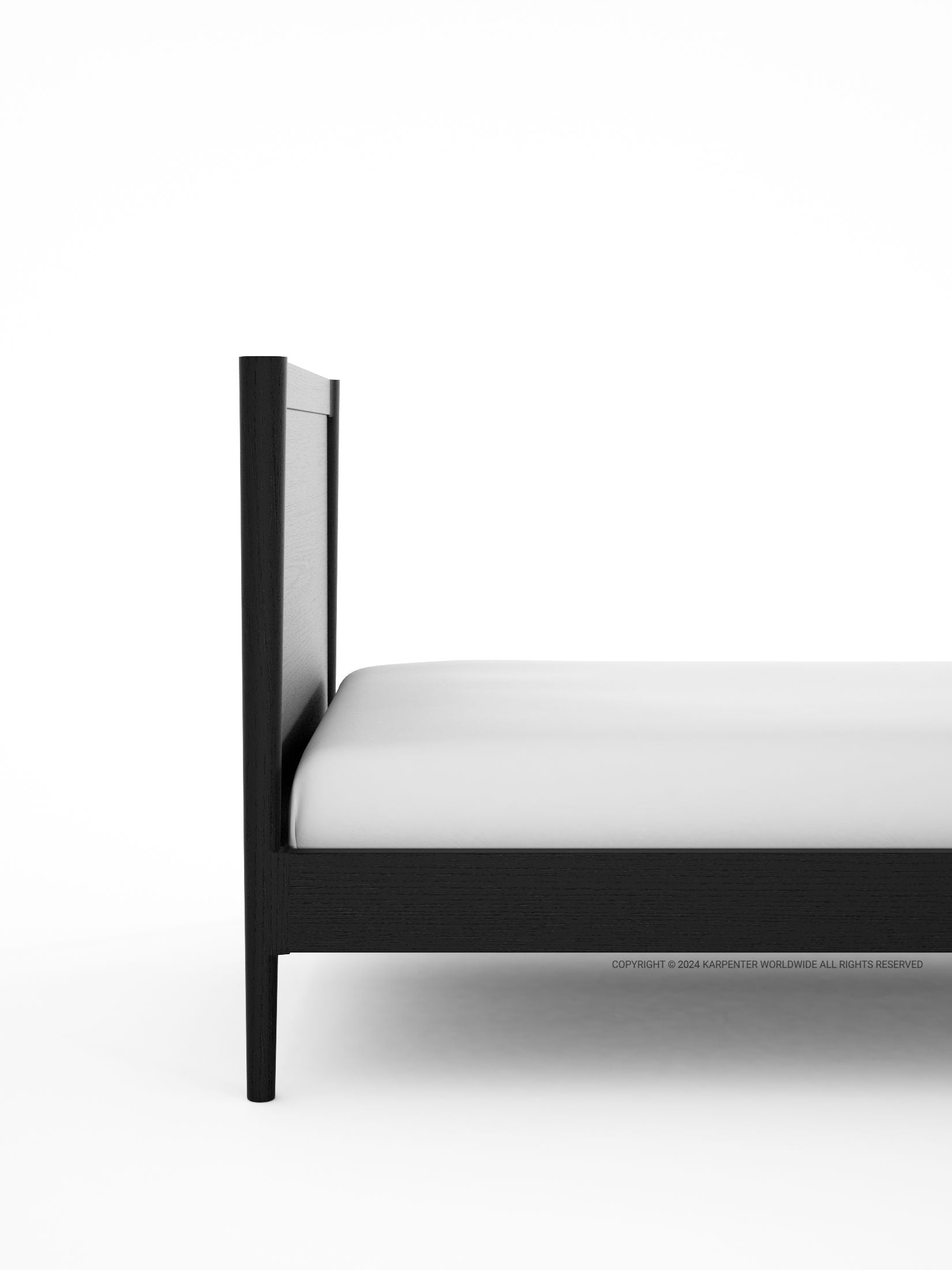 Create a refined, eco-conscious bedroom with the Karpenter Vintage Single Bed—where exceptional craftsmanship meets timeless design for the perfect blend of style, sustainability, and comfort. Crafted from sustainably sourced, solid European Oak timber in a modernist Satin Black finish, known for its tight grain. This premium wood brings a touch of natural elegance and timeless appeal to any space. The bed’s contemporary low-profile design features rounded tapered legs and a floating backboard panel, evoking the mid-century modern style while seamlessly integrating into modern and contemporary interiors.