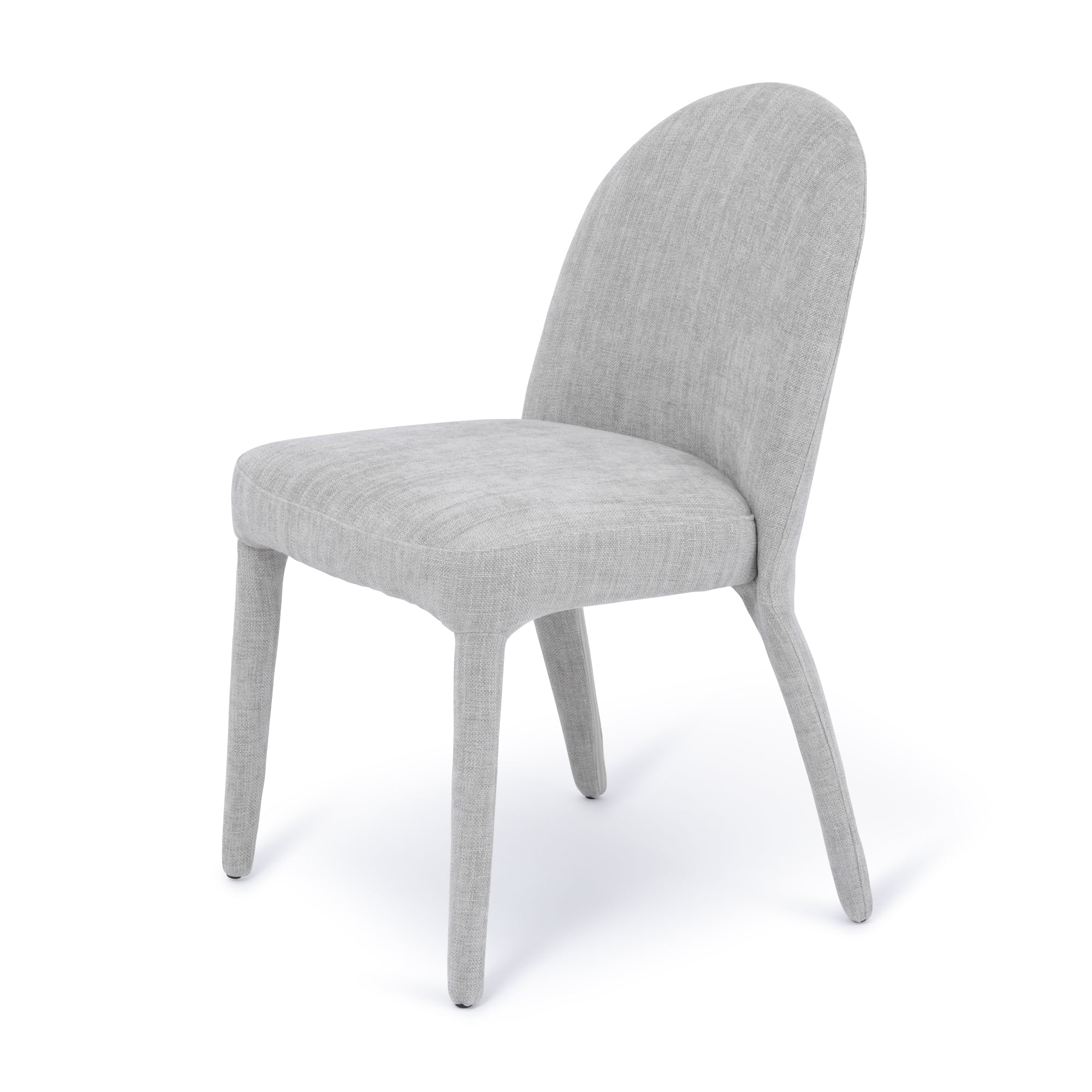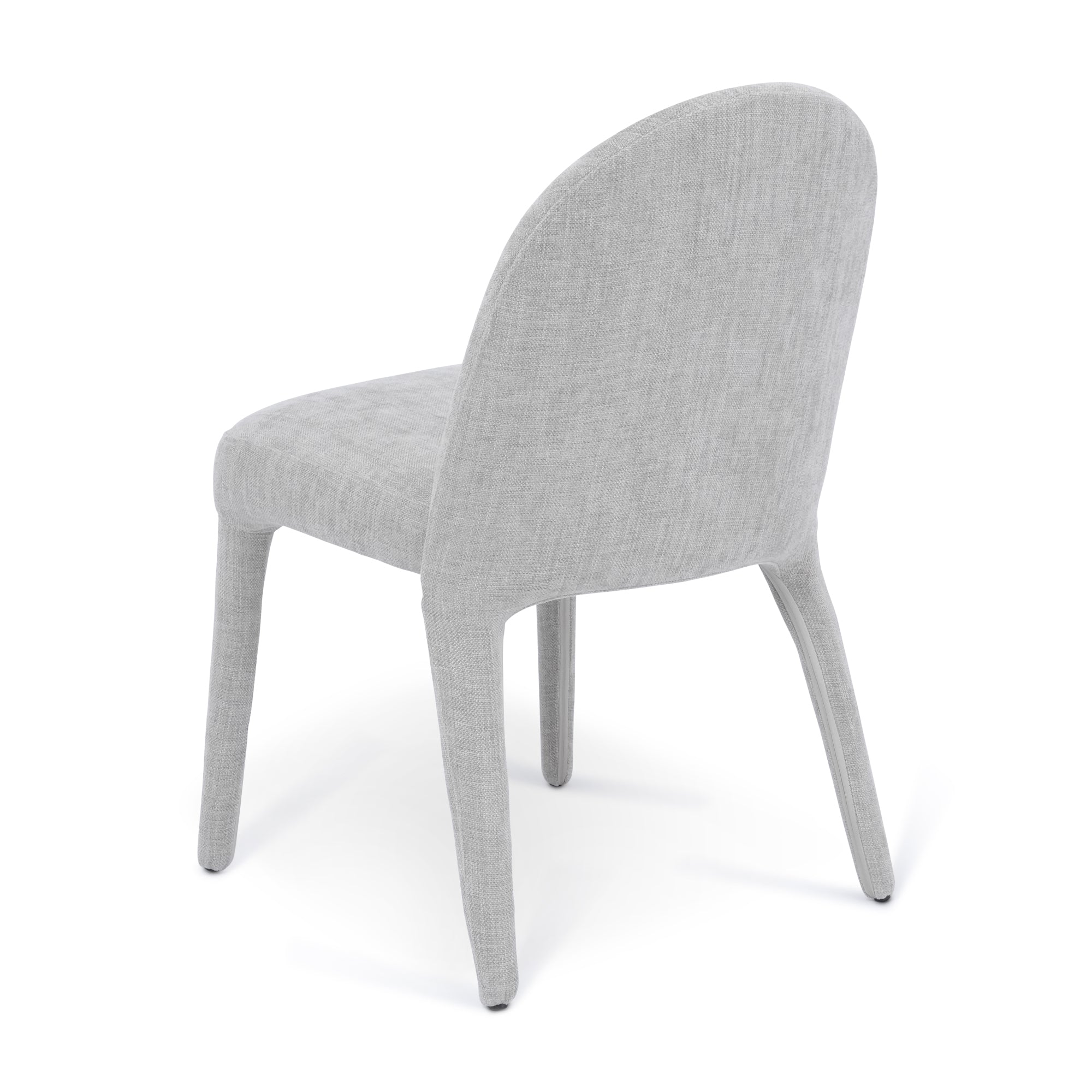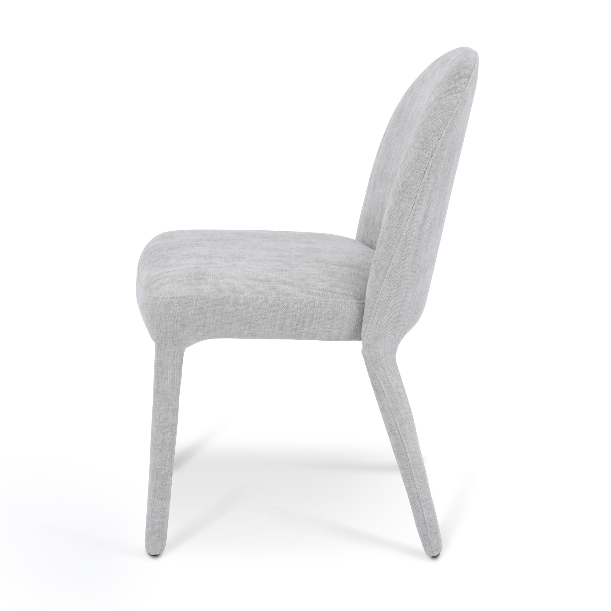 The Wyatt dining chair in Fossil showcases a contemporary design with a touch of minimalist flair. The chair features a sleek, rounded silhouette with a high, curved backrest that smoothly transitions into the seat, creating a cocoon-like form for comfort and style. Upholstered in a soft, light gray fabric with a subtle texture, the chair offers a neutral yet sophisticated appearance that would complement a variety of interior design schemes.